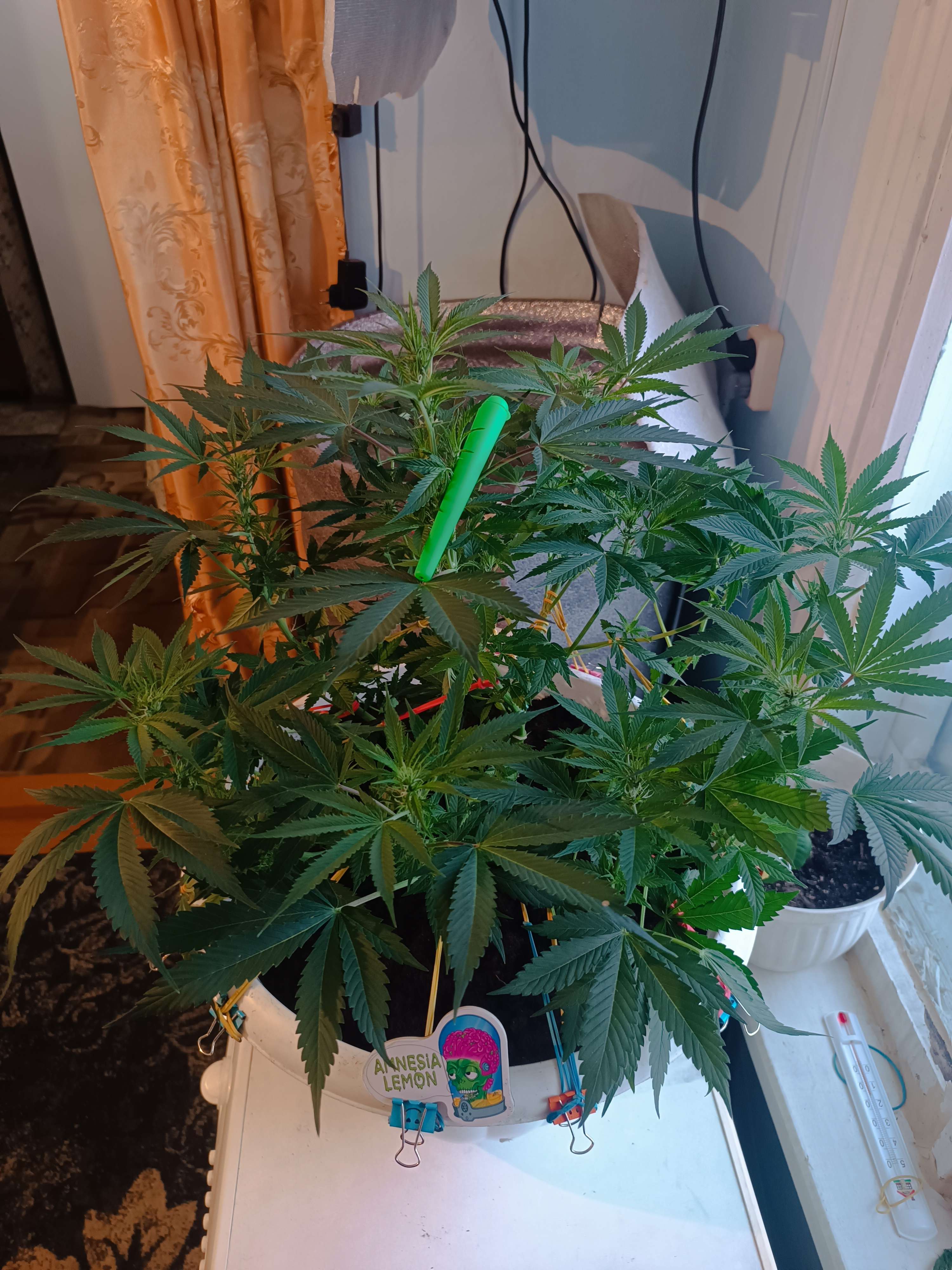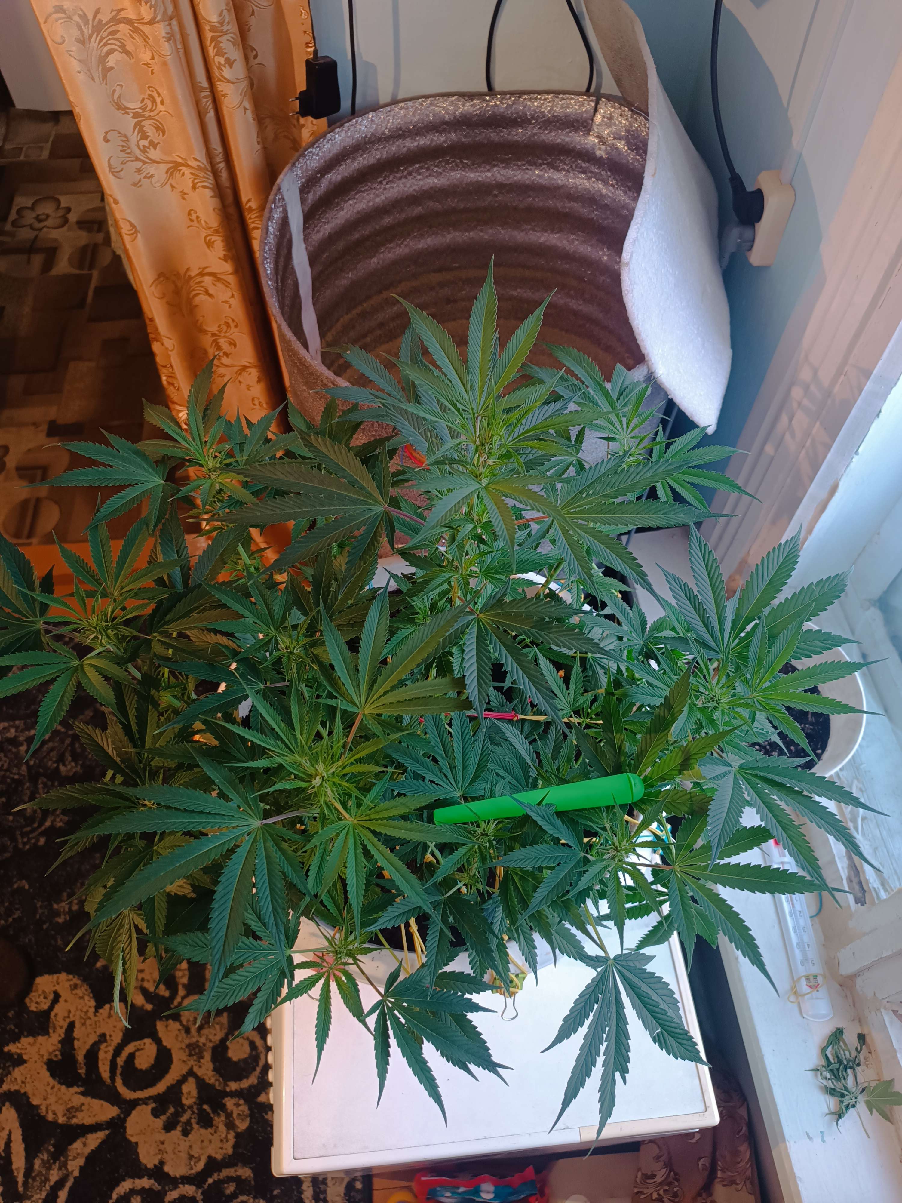 Вечером, солнышко когда заходит, уезжает жить со стиралки в этот рулон на табуретку по сутенерскую лампу) Утром на машику к окну и под эту же лампу. Он и правда в спартанских условиях растёт, без всяких приборов. Замес правда там хороший под жопой, 1.5 месяца без кормежки рос, поливается отстоенной водой, сейчас кушает Агриколу для цветущих