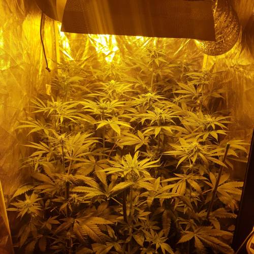 Растихи продолжали тянуться и на пятой неделе достигли отметки в 60 сантиметров. Кусты полноценно зацвели и начали формировать шишки. В гроубоксе появился стойкий аромат, который усиливался с каждым днём. Температура воздуха при включенной лампе составляла 24 С, а влажность воздуха находилась на отметке 50%.