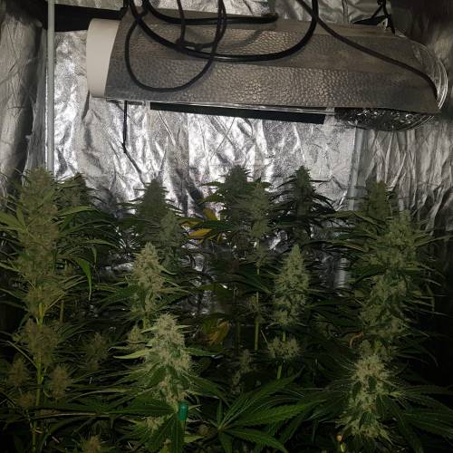 Девятая неделя стала последней, в течение которой растения получали удобрения. Все кустики выглядели как одна сплошная шишка, будто бы ничего, кроме неё на растениях и не было. Стали появляться оранжевые волоски, что сигнализировало о скором созревании и приближении поры сбора урожая.