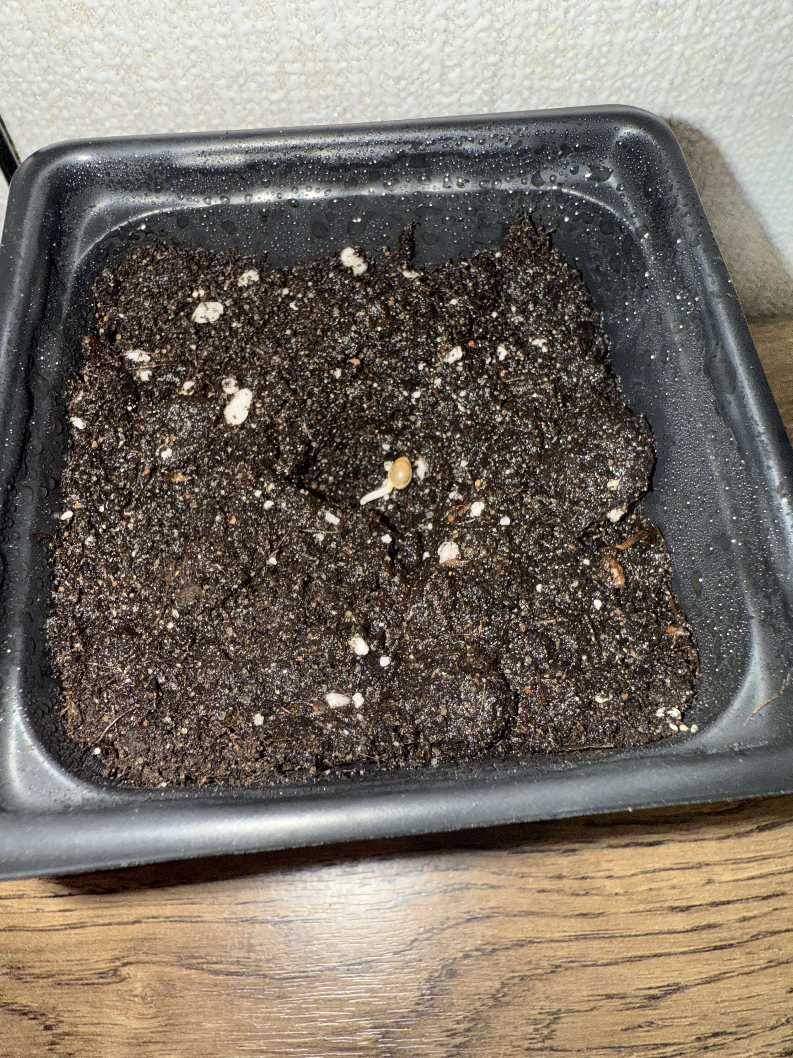 Всем салют, ну вот наступил следующий день, открыв глаза, сразу же пошел смотреть как там растишка, подняв стакан увидел что 🌱 вылезло, но не скинула еще каску. Побрызгав один раз с пулика на растение закрыл стакан и ушел.