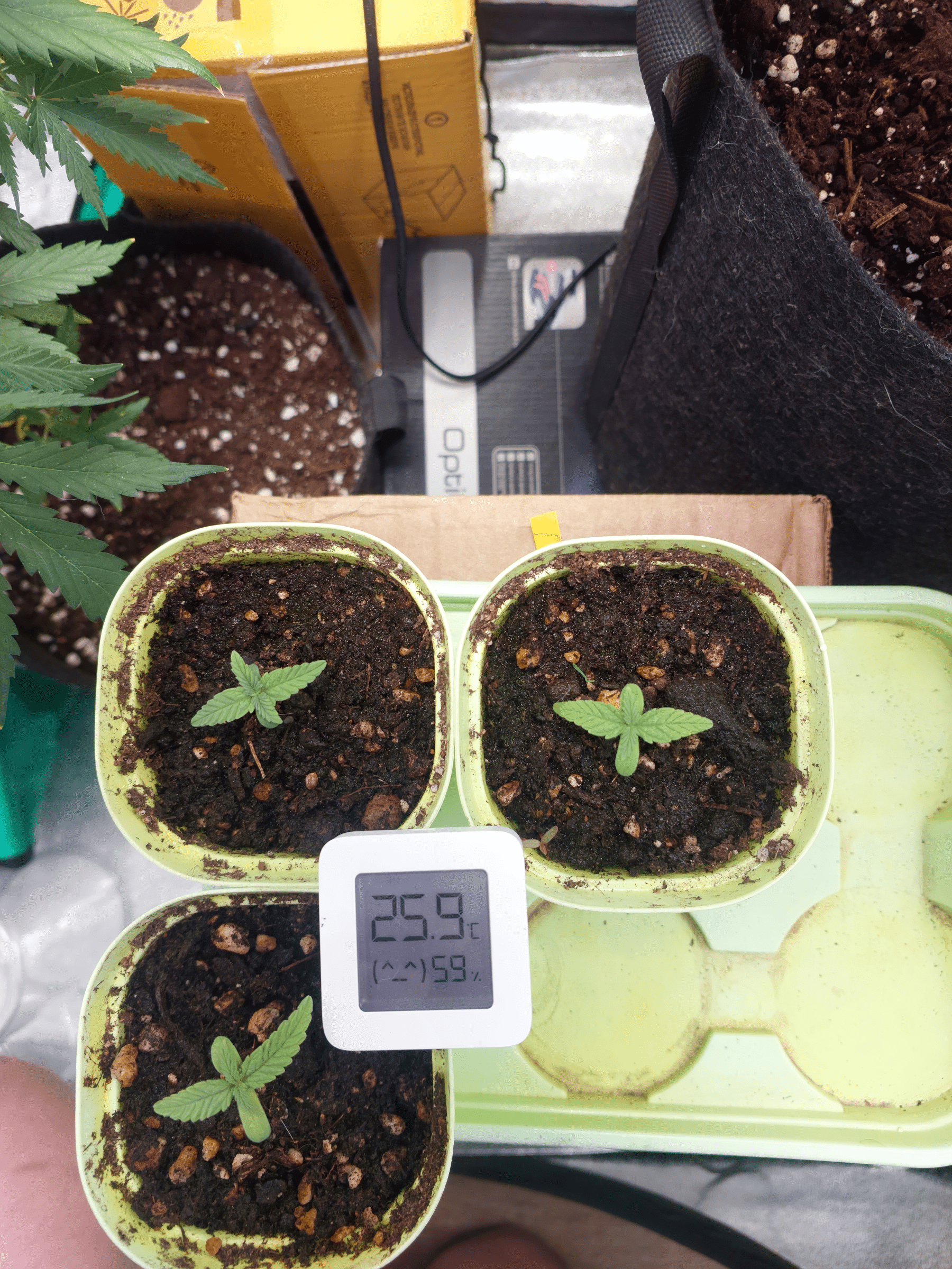 Растишки на первых днях своей жизни столкнулись с экстремальными условиями - температура выше 30, влажность скачет + еще я, кажется опустил слишком низко лампу и они немного подгорели. Лампу поднял до 100 см. Они держатся молодцами:strong. 10 числа полил их из шприца с органикой для формирования корней, остальные поливы водой по мере необходимости.