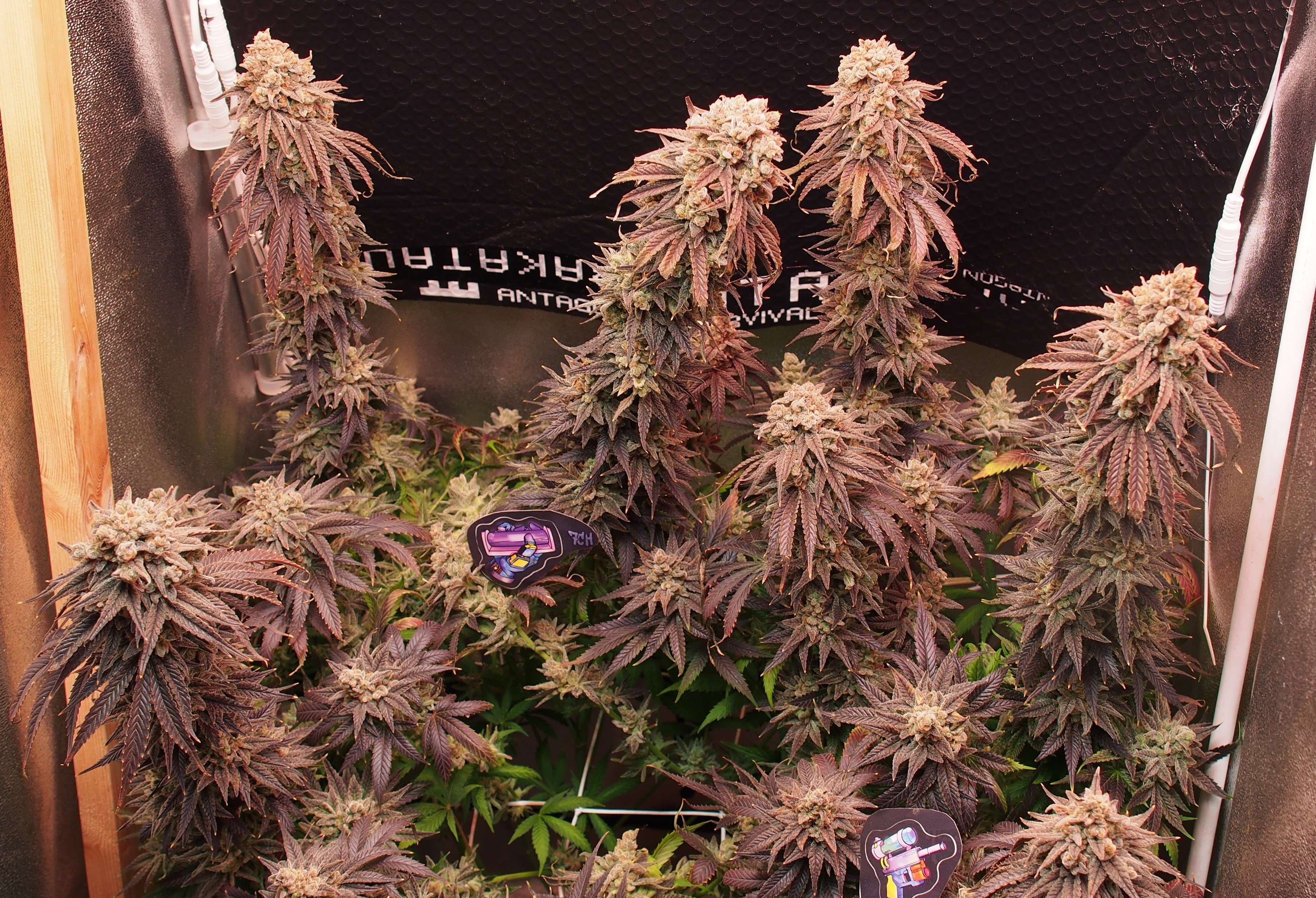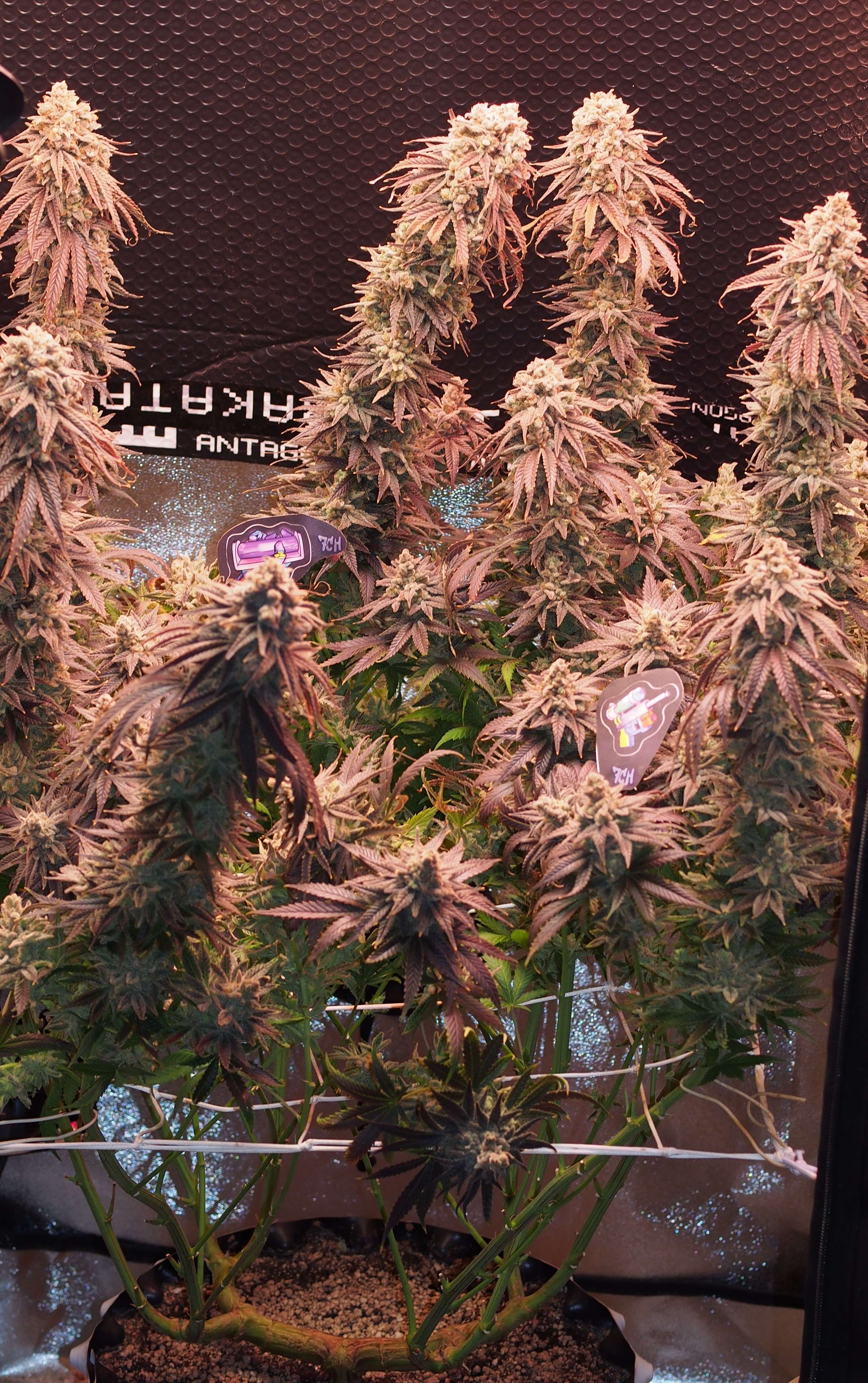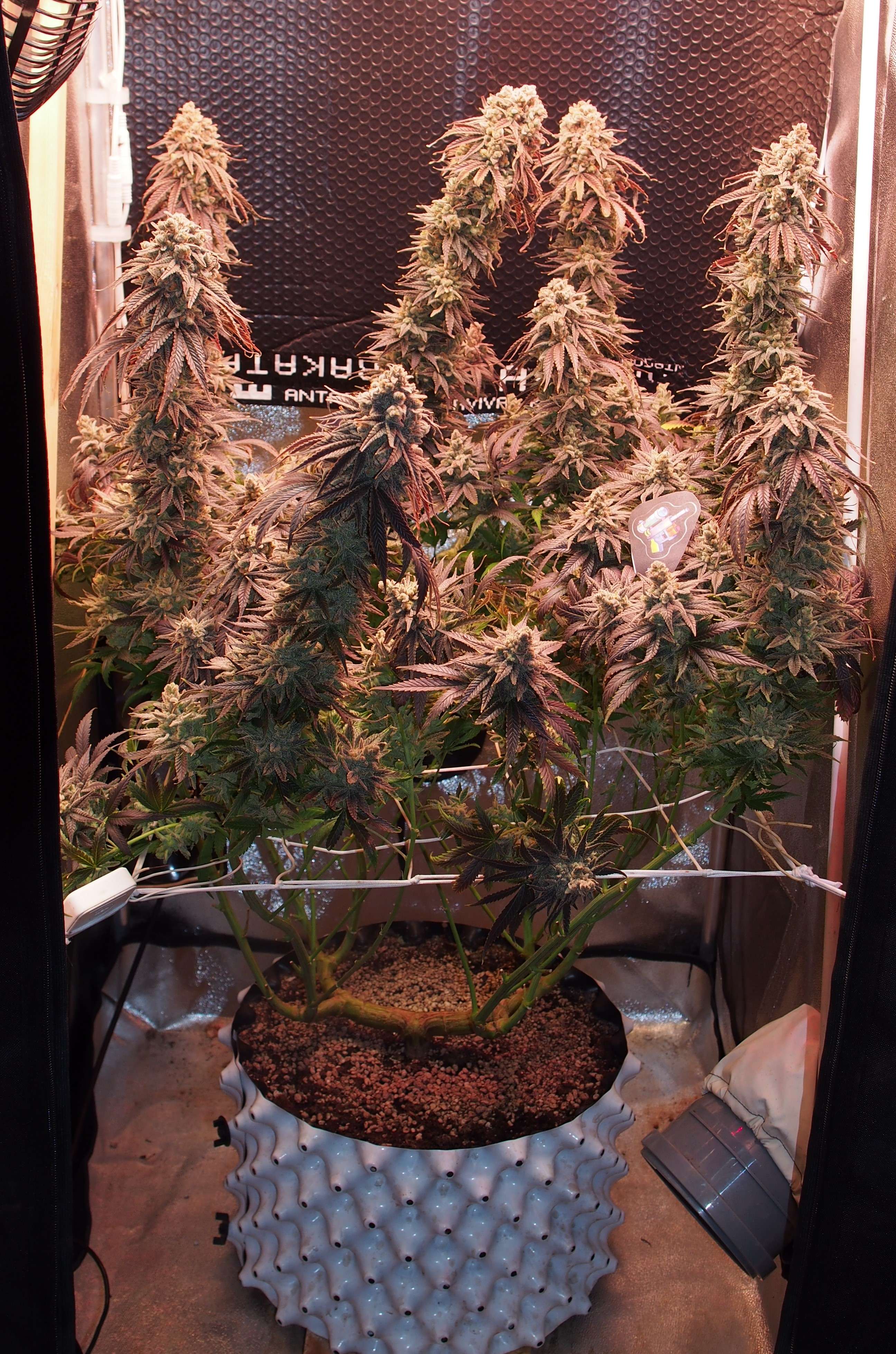 Куст просто разваливается - стебли не выдерживают веса и гнутся/ложатся кто-куда. Их последняя надежда и опора скрог-сетка уже не особо помогает. Я особо за этим не слежу и не трогаю - харвест скоро! Пару кол на заднем фоне висят уже "вверх ногами", но я к ним подобраться не могу не перемазавшись весь. Поэтому самая "фотогеничная" неделя уже миновала и сейчас это просто какая-то монструозная био-конструкция.