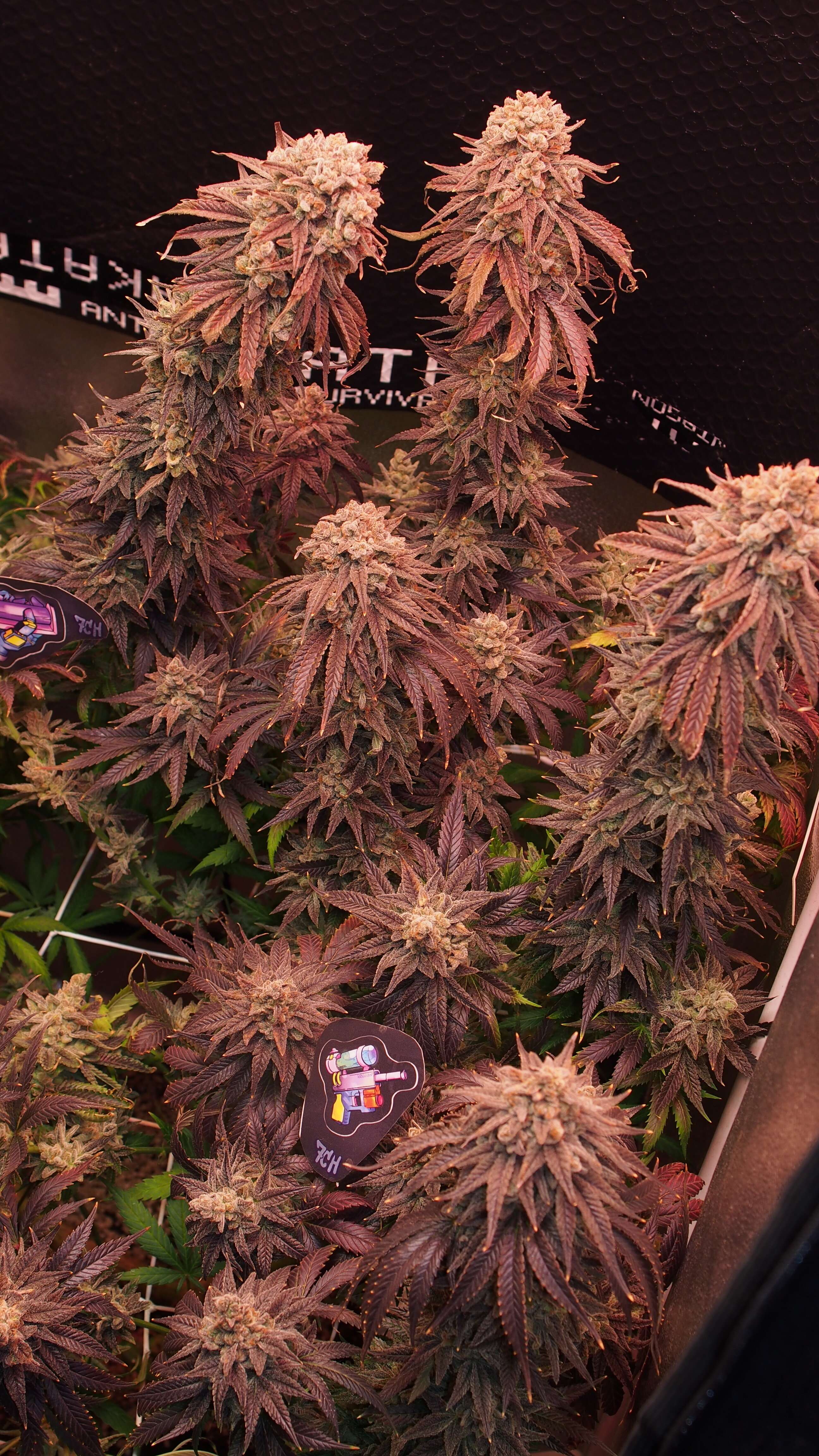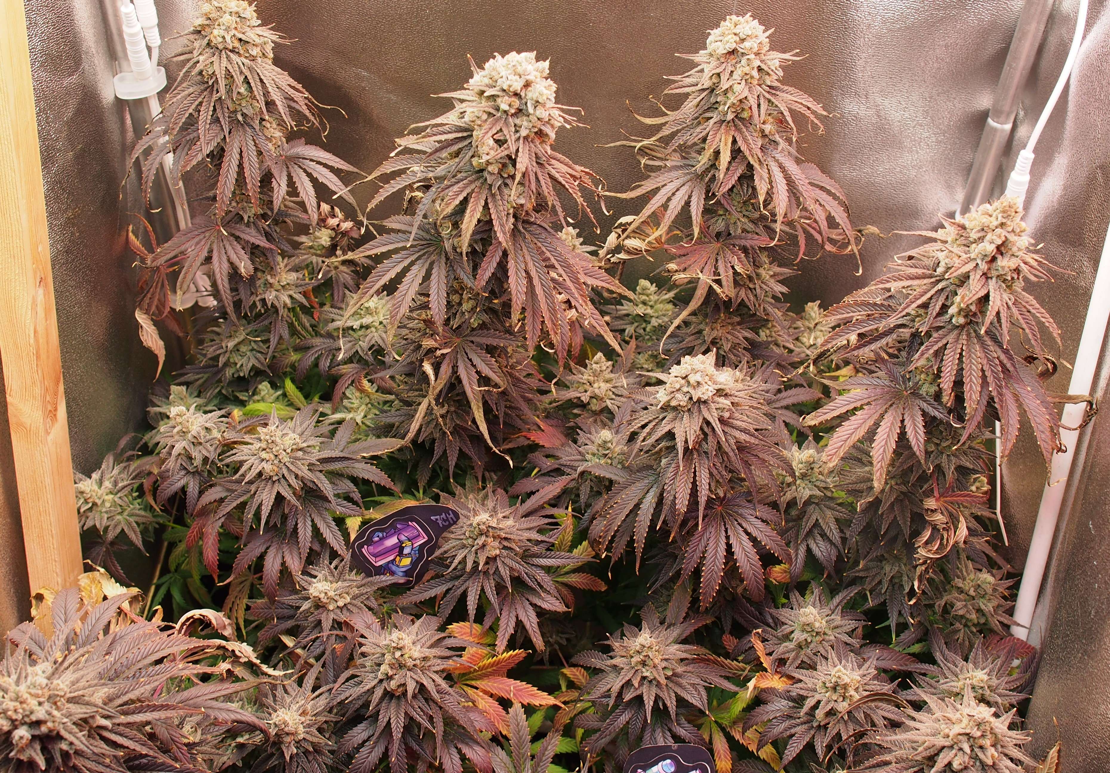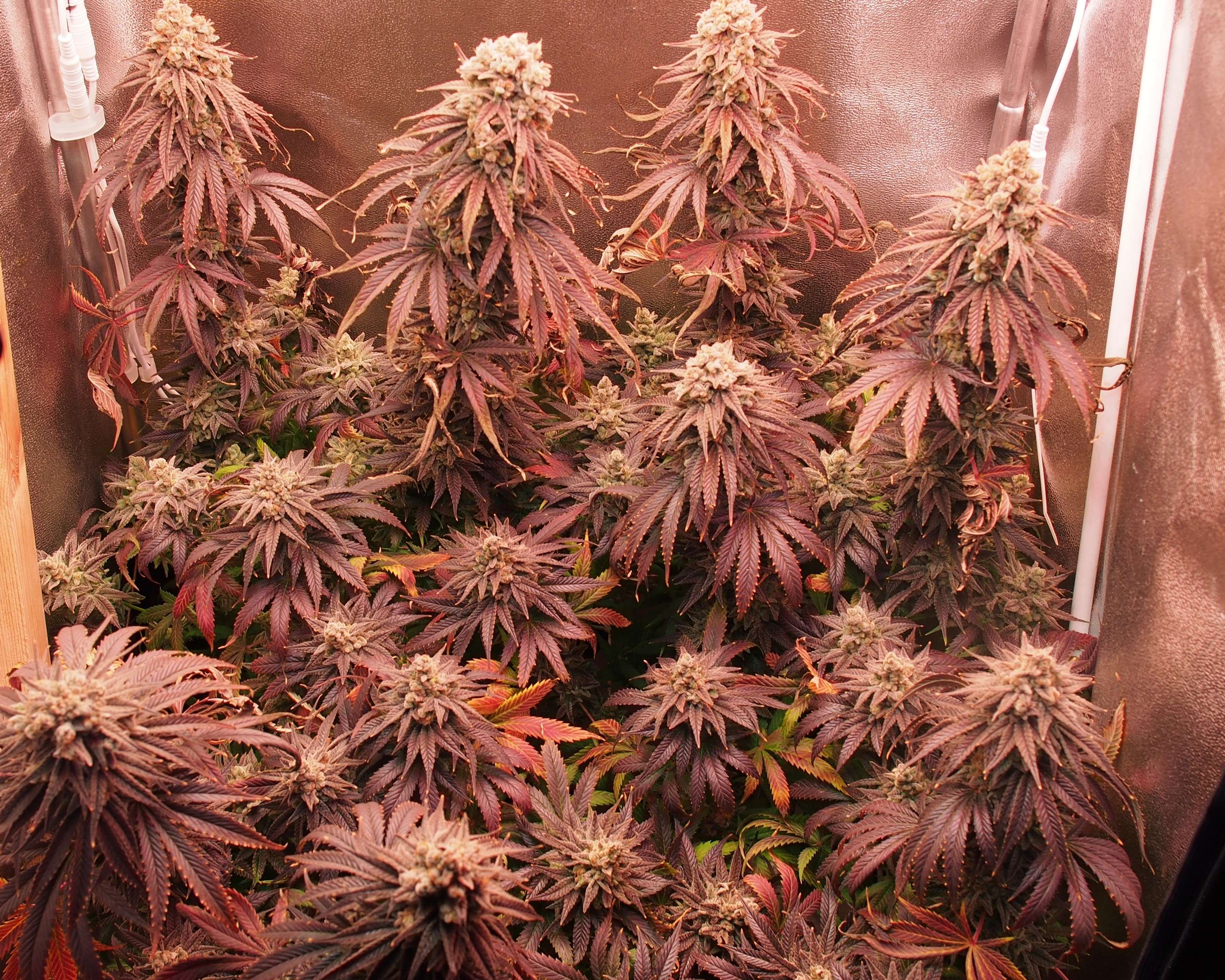 Куст просто разваливается - стебли не выдерживают веса и гнутся/ложатся кто-куда. Их последняя надежда и опора скрог-сетка уже не особо помогает. Я особо за этим не слежу и не трогаю - харвест скоро! Пару кол на заднем фоне висят уже "вверх ногами", но я к ним подобраться не могу не перемазавшись весь. Поэтому самая "фотогеничная" неделя уже миновала и сейчас это просто какая-то монструозная био-конструкция.