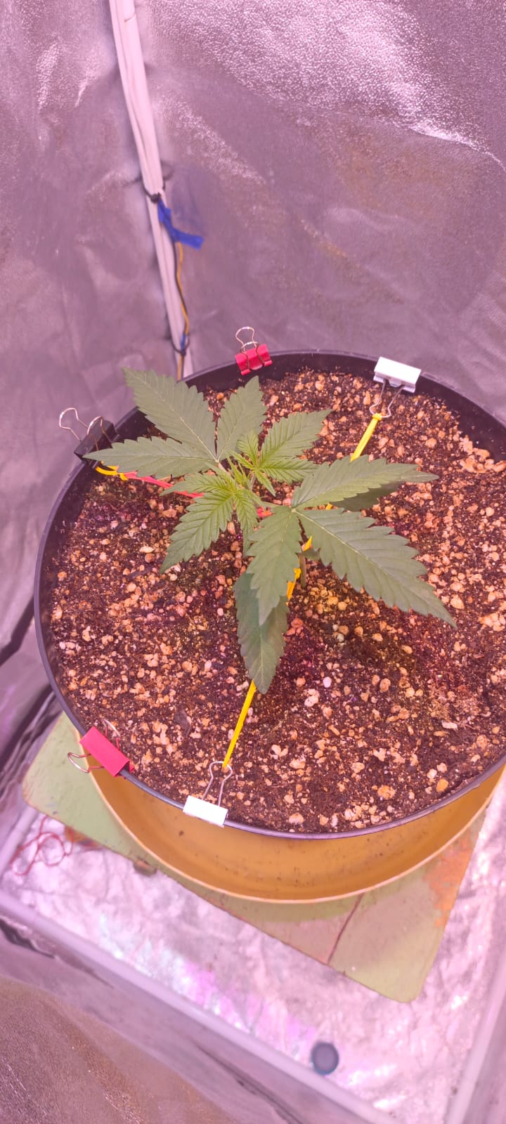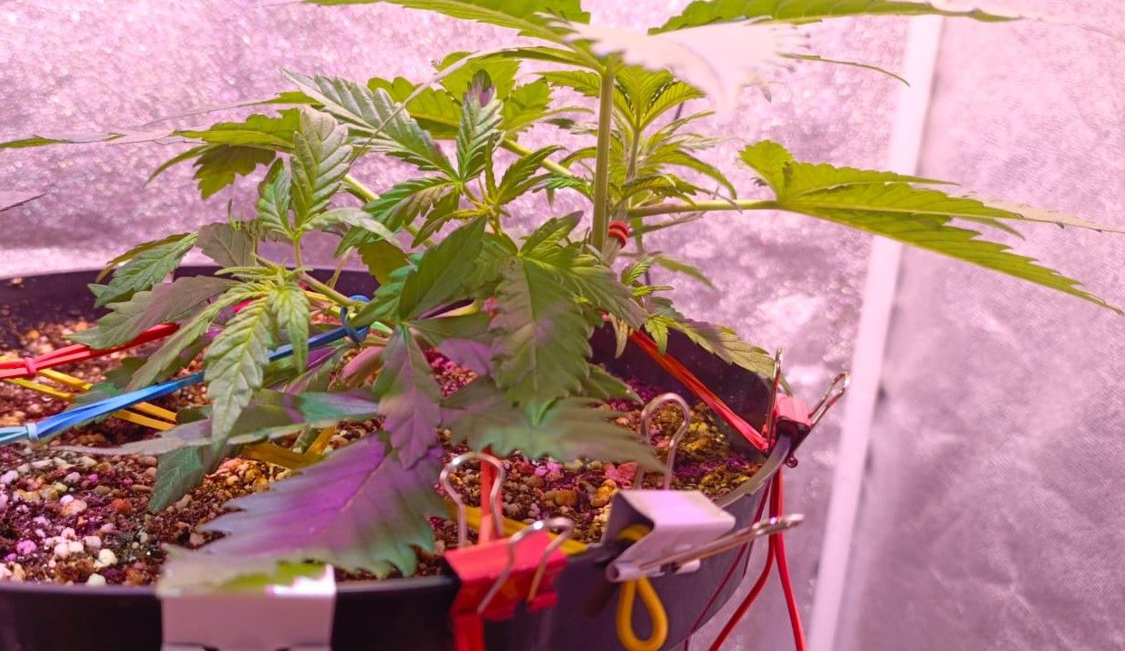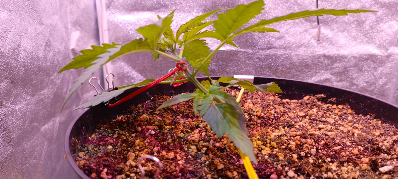 Примерно к 15 дню растение начало набирать массу.Начал применять технику тренировки LST. Под LED 200W растишка чувствует себя вполне комфортно. Температура в боксе днем 24-26 °C, ночью опускается до 21 °C. Вода для полива покупная, по pH до 6,5-6,9. На четвертой неделе рост саженца не очень быстрое, приметно 12-15см.Поливаю почти каждый день по схеме.
