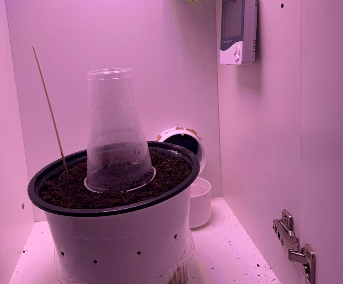 Стоит пока под стаканом с дырочками так как влажность в боксе