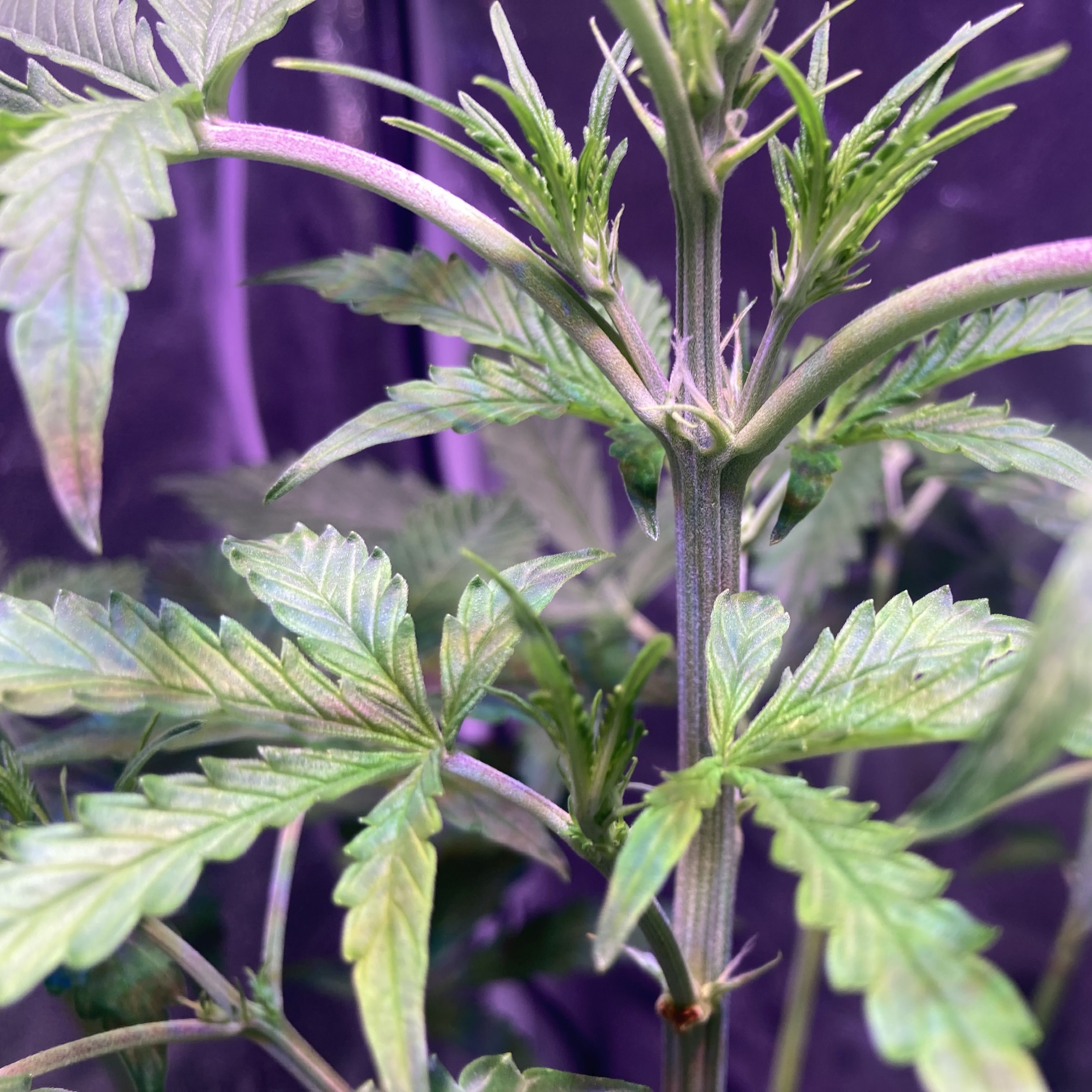 Убираю нижние этажи от боковых побегов: так стебли будут толще и обрастут массивной шишкой. Удаляю веера, закрывающие свет верхушкам. В боксе слышится лёгкий травянистый дух.