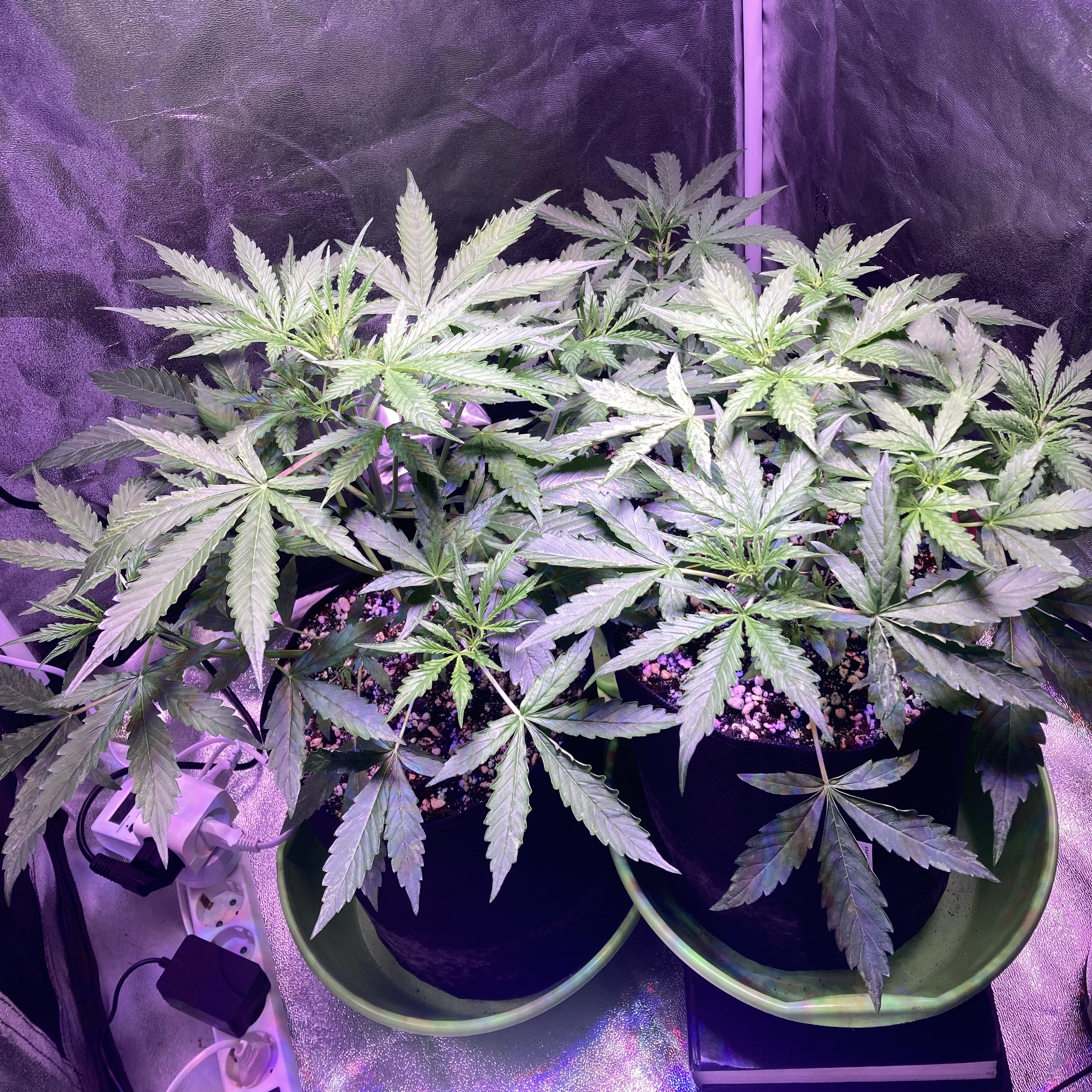 Рок-машина мощно тянет резину, словно пытается сорвать прищепку! Благодаря низкострессовой тренировке, свет ровно расходится по кроне, а побеги друг другу не мешают. Дефолиация убирает тень и добавляет пространства для развития. Запах полевой травы стал насыщенным и едким.