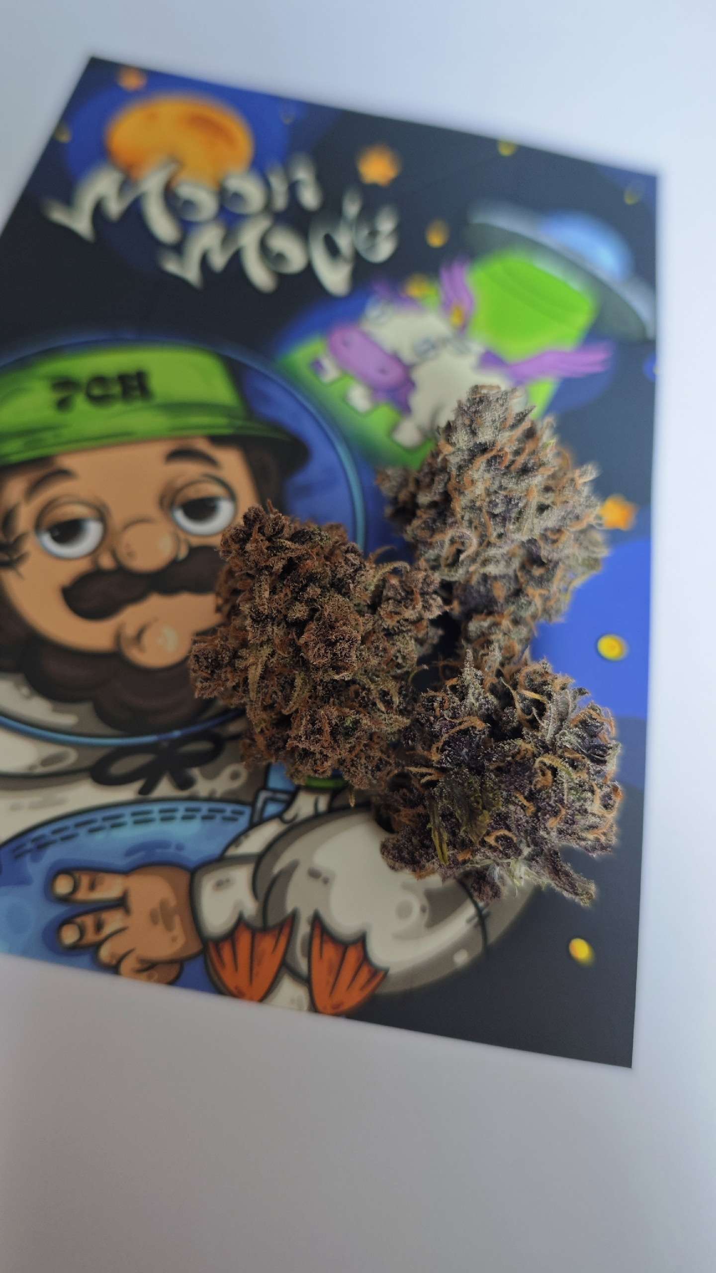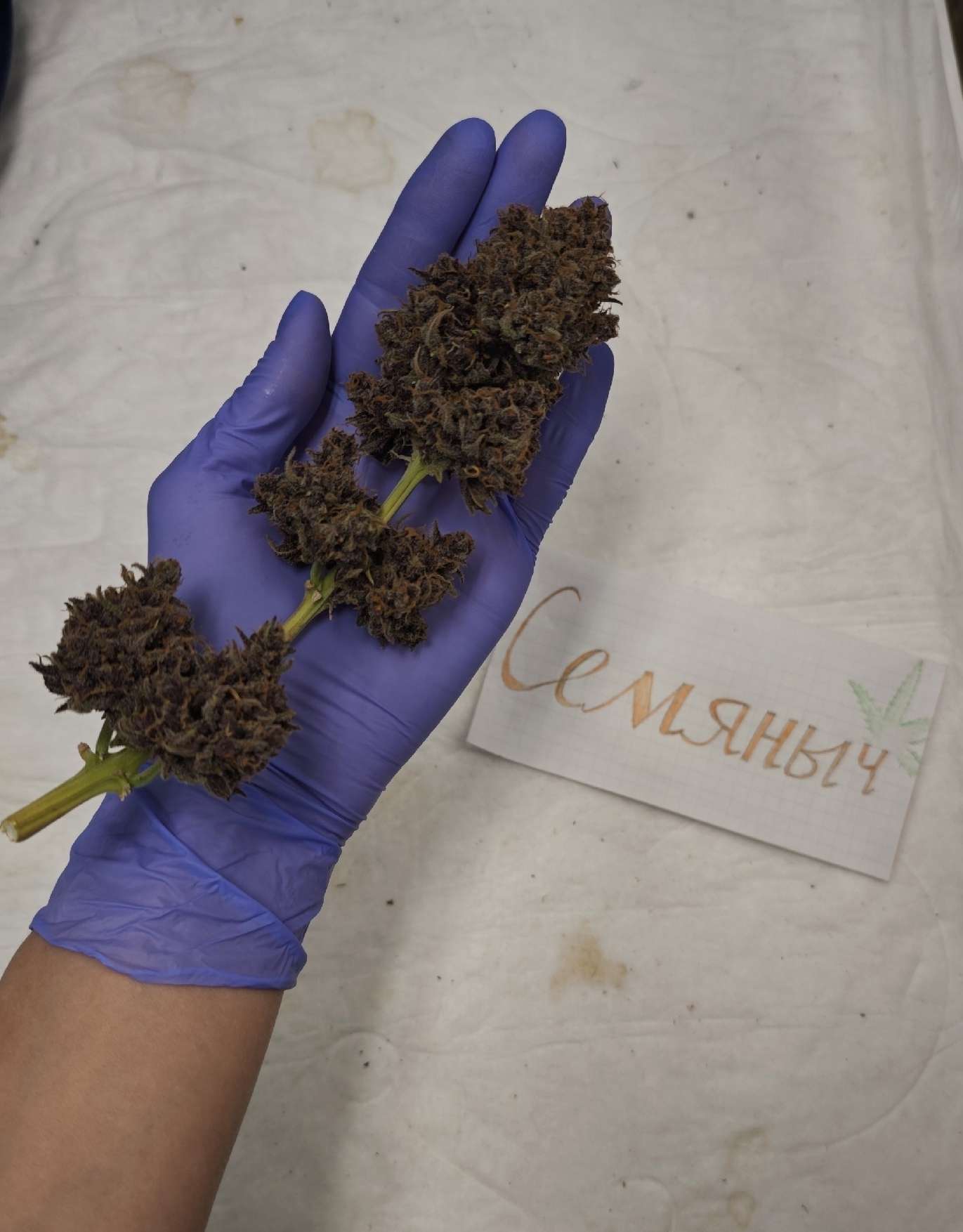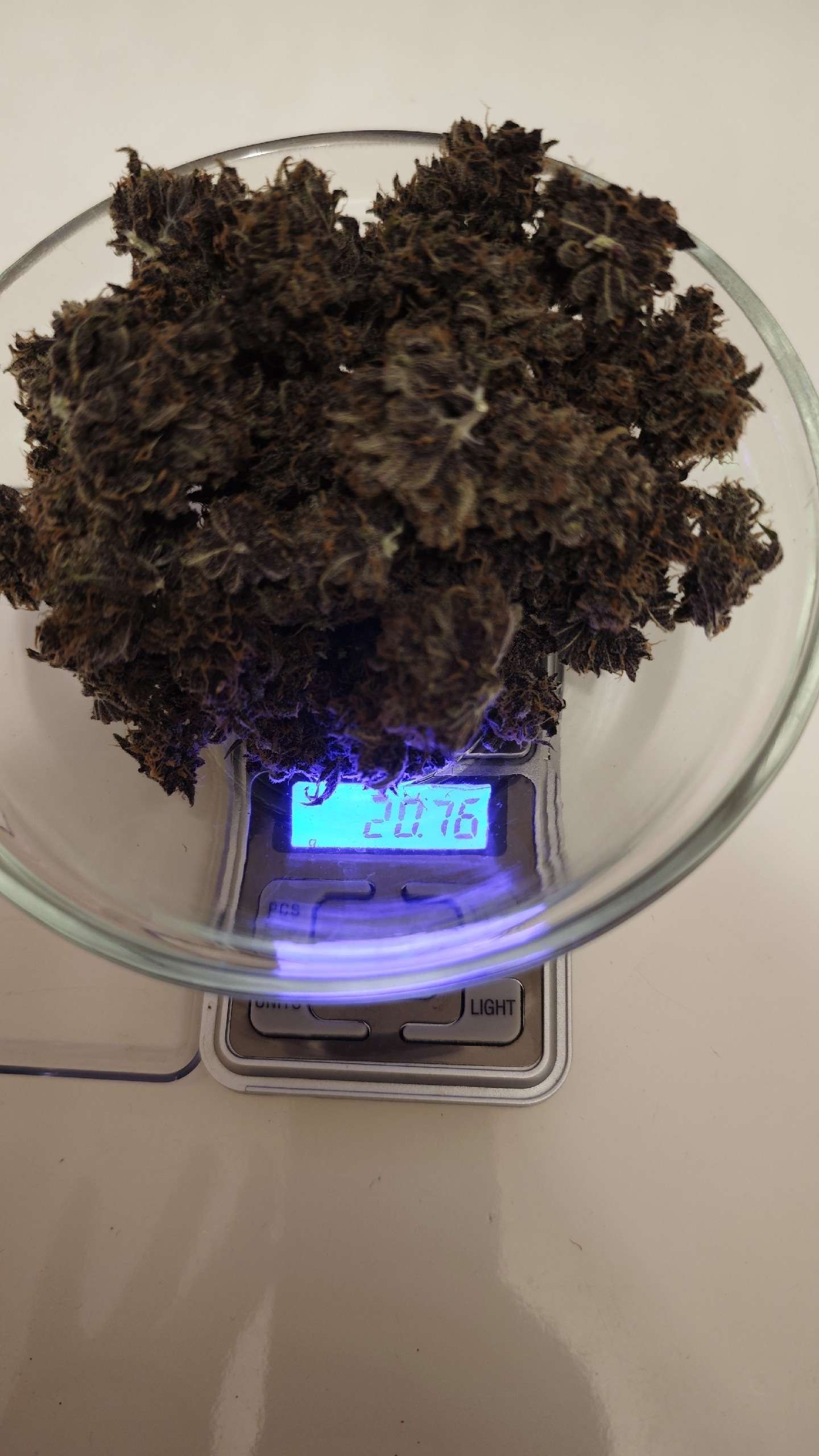 Понравился фиолетовый цвет, я из-за цвета, в том числе, и выбрала этот сорт. Сухие шишки почти черные. Если бы не белые трихомы, которые высветляют шишки, реально были бы черными. Не могу объективно судить о сорте, потому что рос с проблемами, как следствие вырос коротыш. Были непонятные дефициты, от которых листья сохли и отваливались на предцвете и цвете. Никто не смог понять что это. Но и прошло само. Но рост из-за этого затормозился прилично. Было пару моментов, когда отключался свет на несколько часов. Ну и листья с врожденным пороком - примерно 13-15 листов было корявых и недоразвитых, будто их погрызли, но по факту они такие рождались. И был еще один период передоза органикой (мой косяк), который длился недели 4-5. Может семка старая и нежизнеспособная, а я ее вытянула - и тогда сорт крут, крепкий. А может много стрессов выпало на ее судьбу по моей вине и по воле случая - не знаю. Поэтому выводов о сорте, основанных на процессе выращивания, не будет.