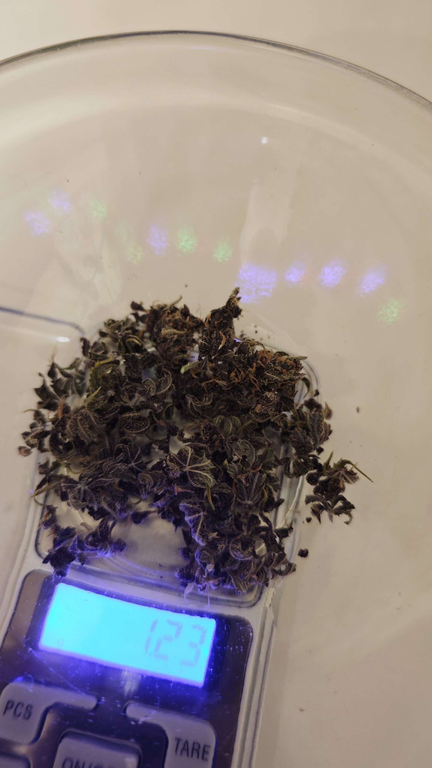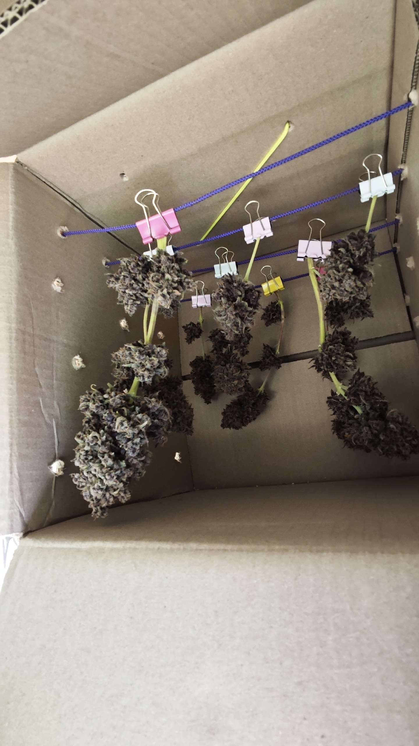 Срубили нашу елочку по самый корешок... на 13 неделе. Поскольку в боксе рос другой малыш, пришлось сушить в коробке внутри бокса. Сделала дырочки для проникновения воздуха внутрь, повесила вент близко к коробке, чтоб прям внутрь задувал. И с другой стороны был фильтр с вытяжкой. Все это под потолком над лампой. Сфотать всю конструкцию было нереально, все очень близко друг к другу расположено. Ну ничего, высохли. Хоть я и переживала, что в коробке вентиляция будет слабая. Трое суток сохли в боксе, потом еще сутки просто на полу в продуваемом помещении. На 5е сутки отправились в банки. Перед банками взвесила - 20.76 шишки + 1.23 очень трихомистый трим и мелкие соцветия, которые отваливались, когда срезала коряво. Короче их тоже можно причислить к шишкам. Итоговый вес - 22 грамма ровно. После пролечки конечно уменьшится немного, но мы этого никогда не узнаем, поскольку шишки уже пошли в расход) Остальной трим высох и будет пока просто лежать в ожидании трима с другого куста, чтоб отправиться на масло. Его я не взвешиваю, потому что там и лопухи и сахарные листочки - все вперемешку.