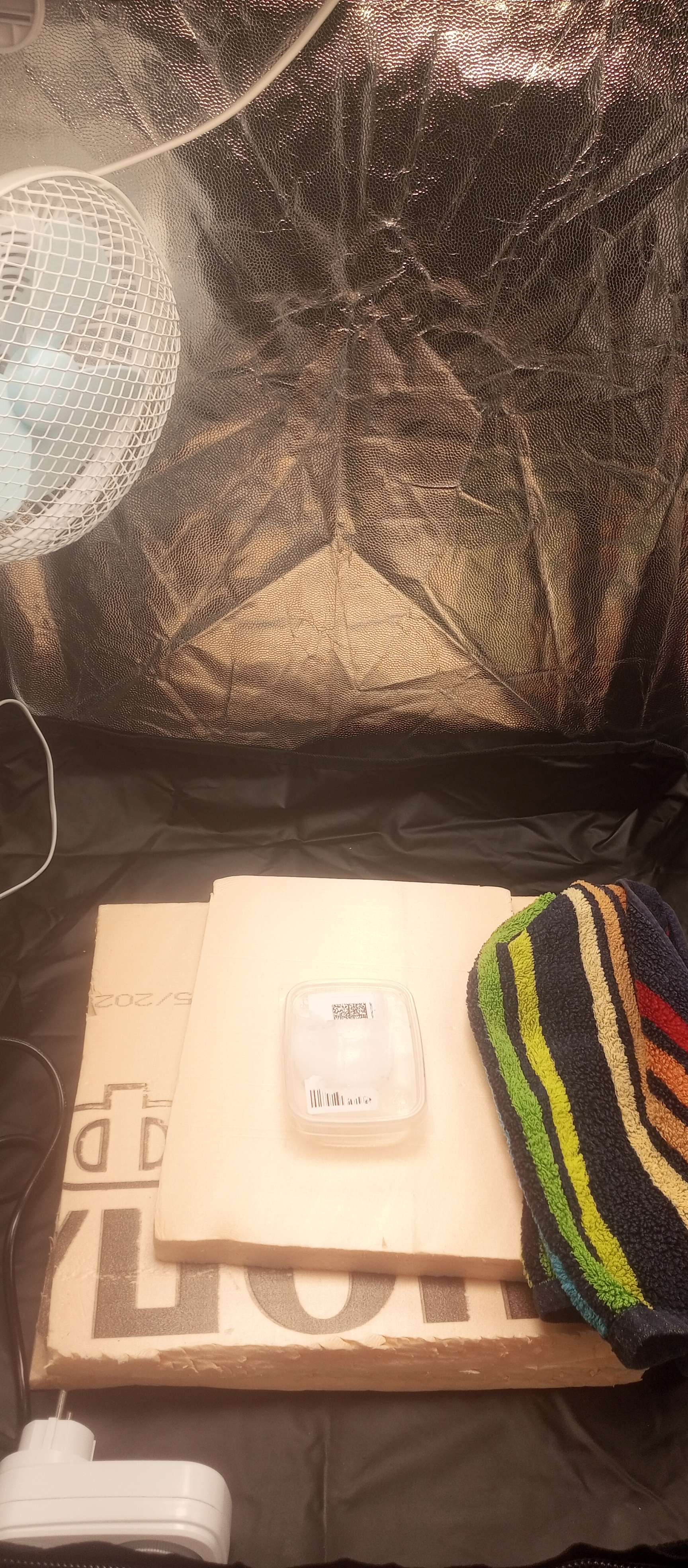 На данный момент семечко уложено меж влажными ватными дисками, по опыту прошлого взращивания, и создана температура в боксе, путем включённой ледлампы, 35 гр. +- 1 гр.