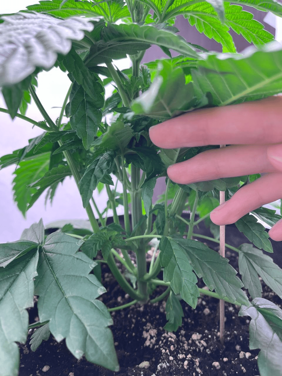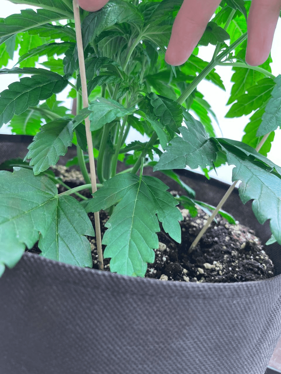 Он у тебя уже сильно оброс, уже вопрос надо ли вообще гнуть ? Можно обрезать пару листков/второстепенных кол и нагнуть раз фотик, пару дней постоит, а потом оклемается, но надо ли оно тебе, решай сам)