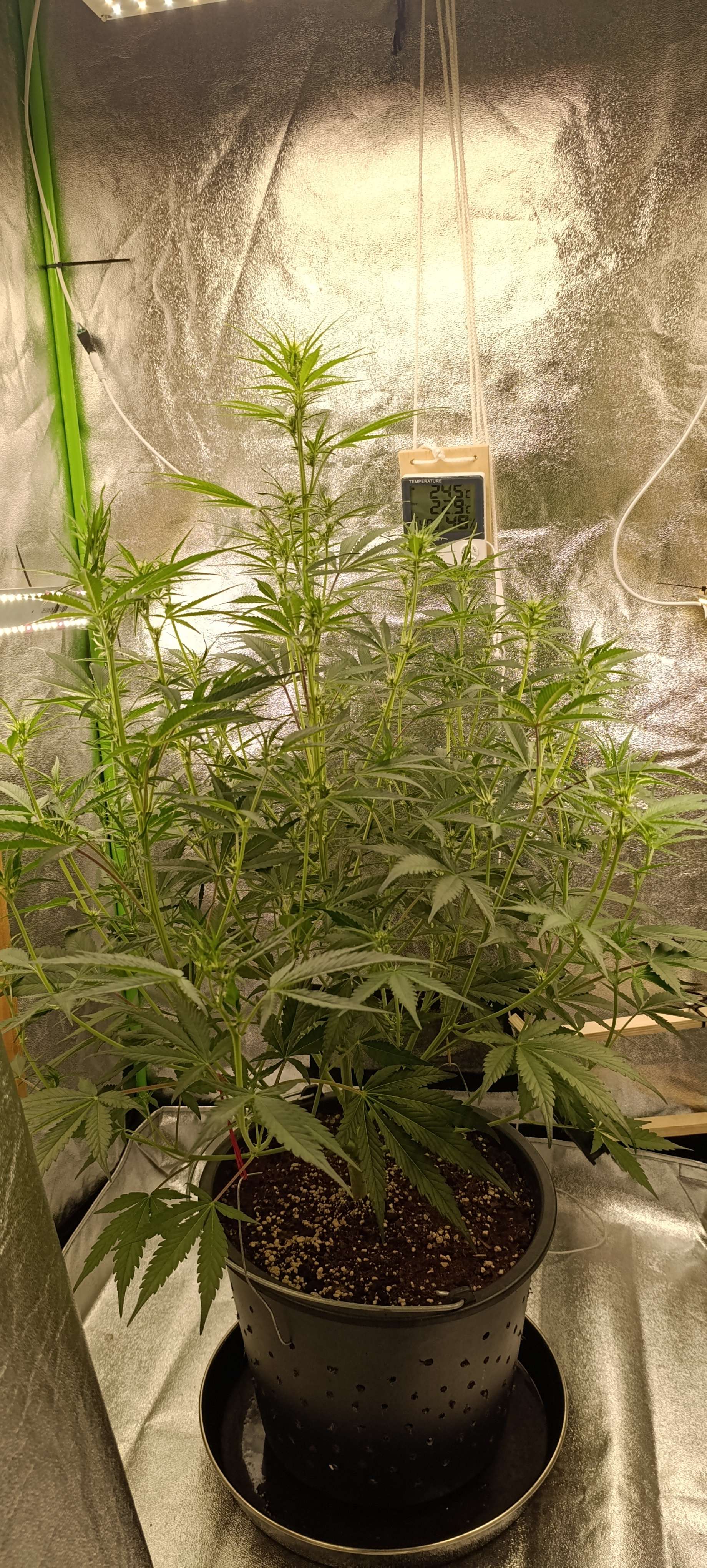 Прасковья стремительно растёт в высоту. Много пьет, перешли на поливы по четыре литра через 36 часов. Дренаж грамм 50. Количество удобрений будем приближать к рекомендованным в таблице. Периодически проливая водой. На данном этапе стремительно вытягивается, на 39-й день 78 см. Подрезаем лопухи каждый полив.