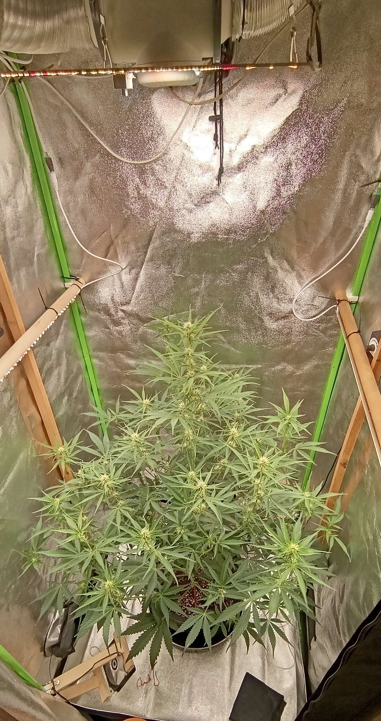 Полили компотом 4 литра, выпивает такой объём часов за 40, попробуем поливы раз в двое суток. Рост встал, начали набухать соцветия. Новых очагов проявления недовольства по поводу питания, в виде больных листьев, не заметили. Поражённые удалим через пару дней, пусть отойдёт. Свет 48000.