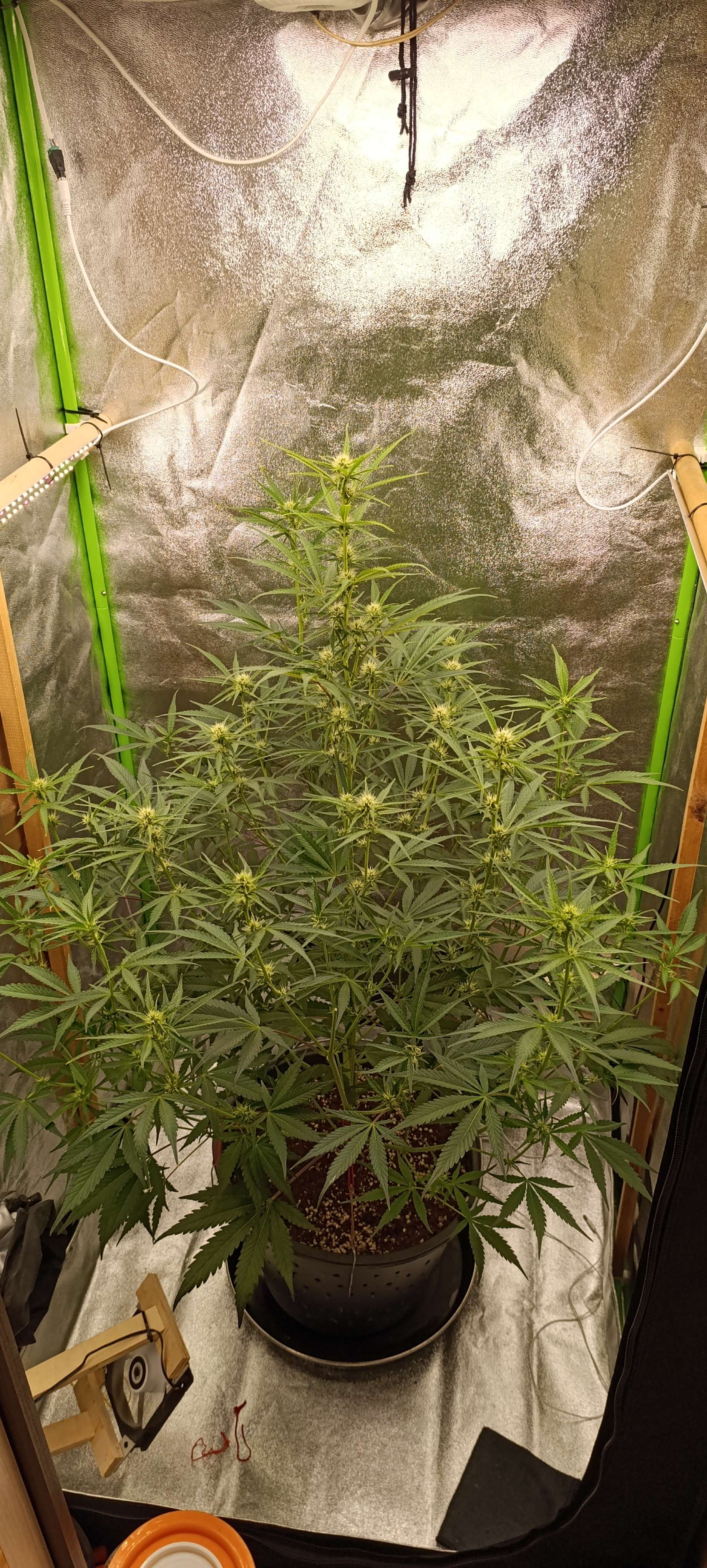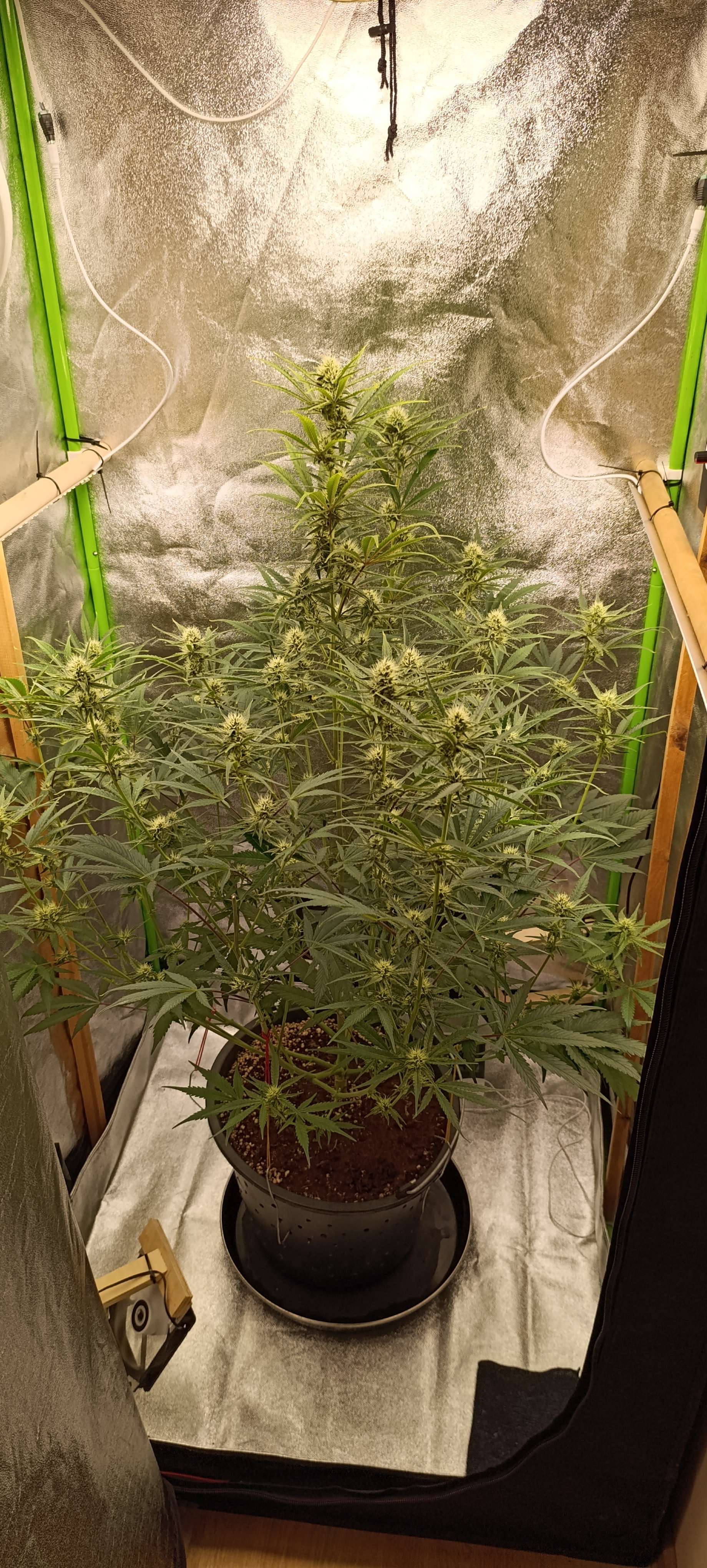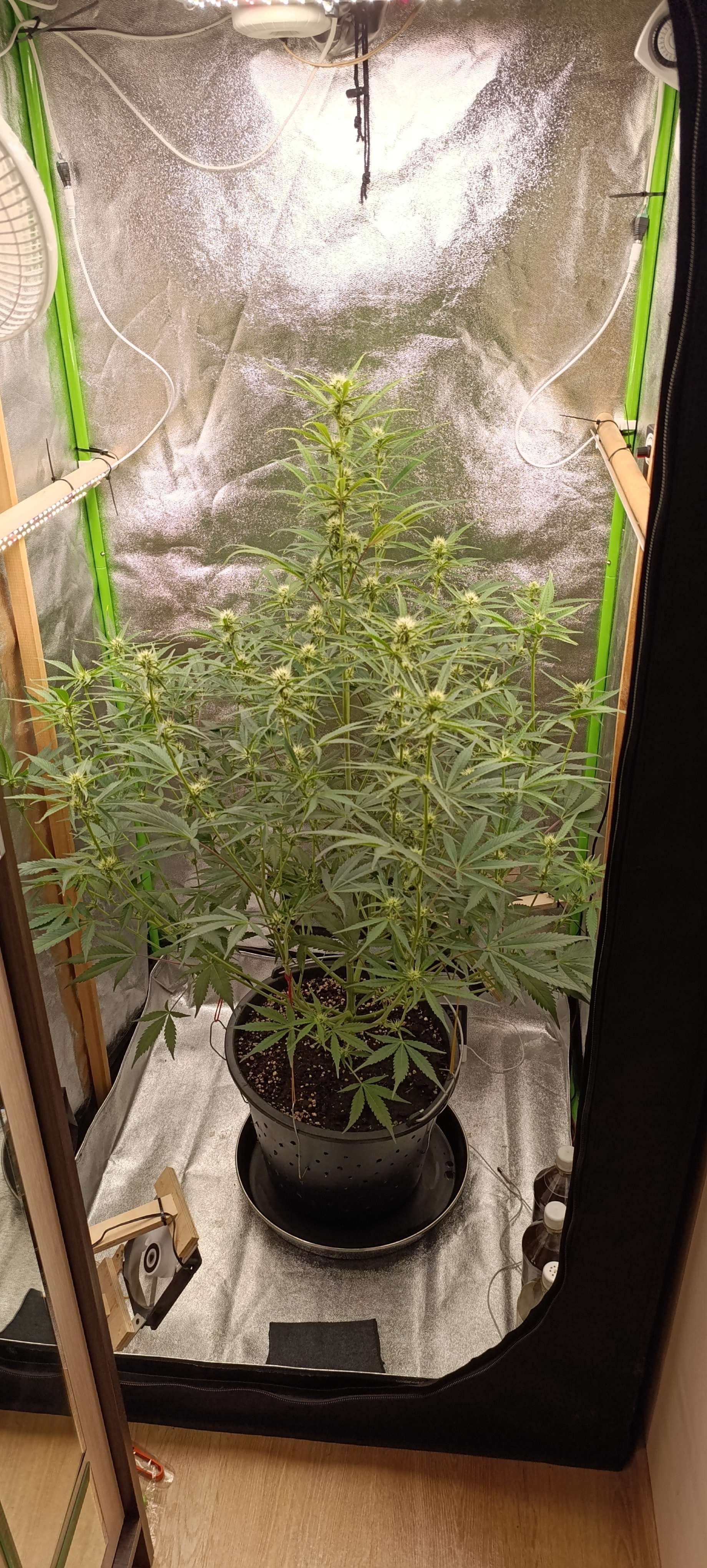 Полили водой с CalMag 3,5 литра. Поливы пока без изменений, за сутки этот объём выпивает. Удалили ещё несколько отростков без шишек.