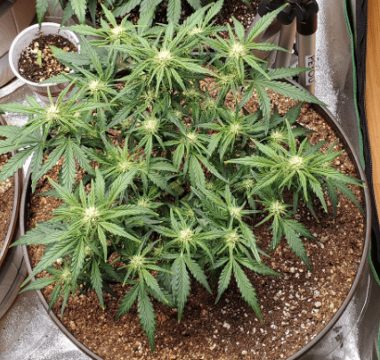 На шестой неделе растение продолжало расти и формировать соцветия. Все макушки уже были полностью в пестиках и на них начали появляться первые трихомы. Рост куста достиг высоты в 16 см. Расстояние до лампы сократилось до 91 см. Аромат усилился. Гровер еще раз провел обрезку листьев на кусте, чтобы все шишки получали больше света. Все условия выращивания оставались прежними. Также гровер начал добавлять в питательный раствор удобрение FloraBlend в дозировке 1,3 мл/л. Все остальные ингредиенты и их количество оставались прежними.