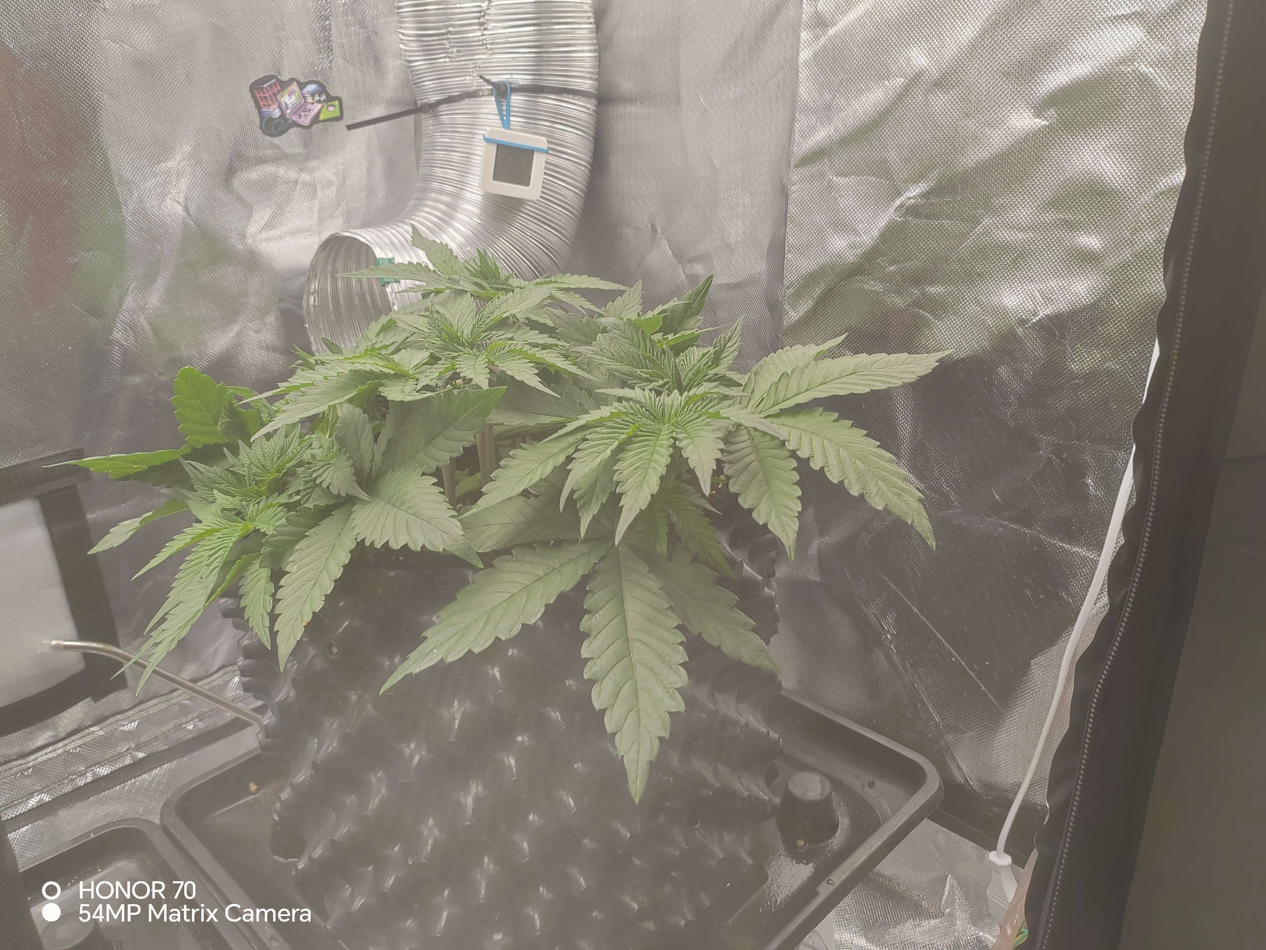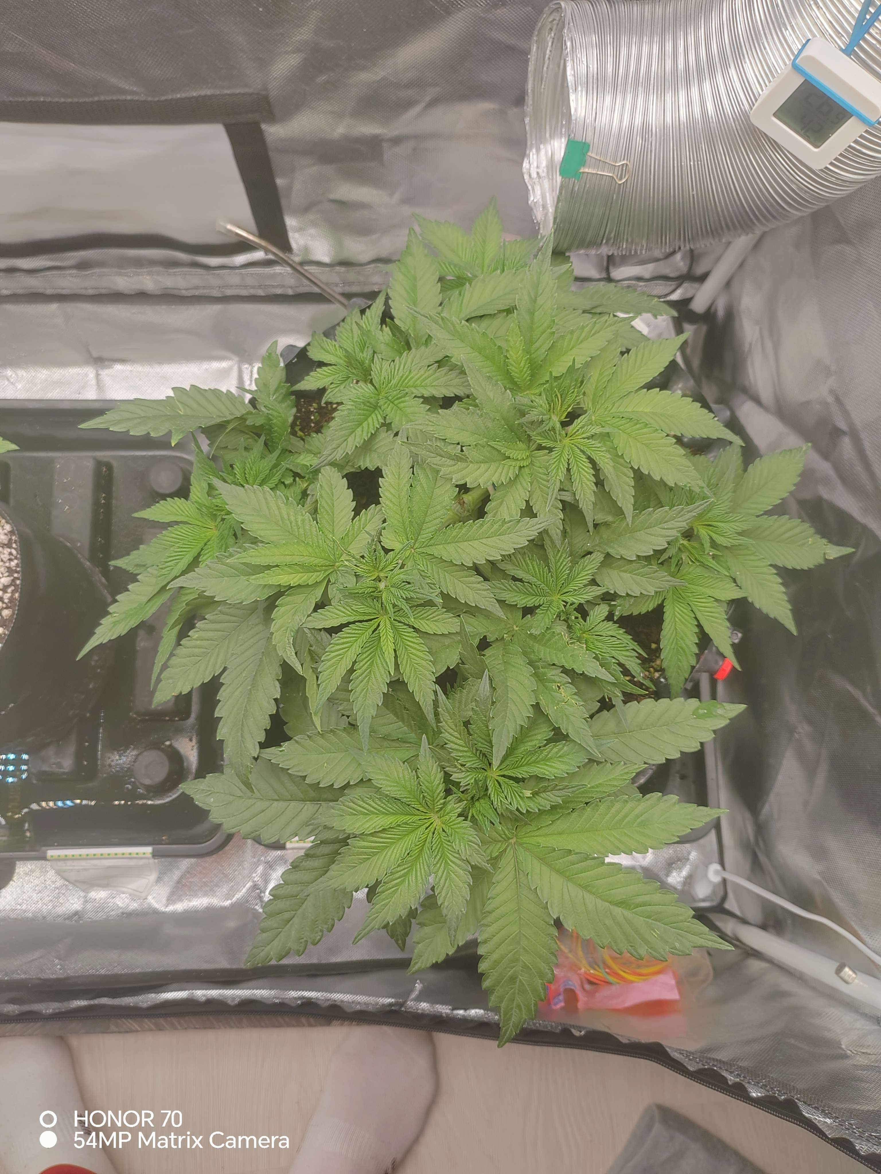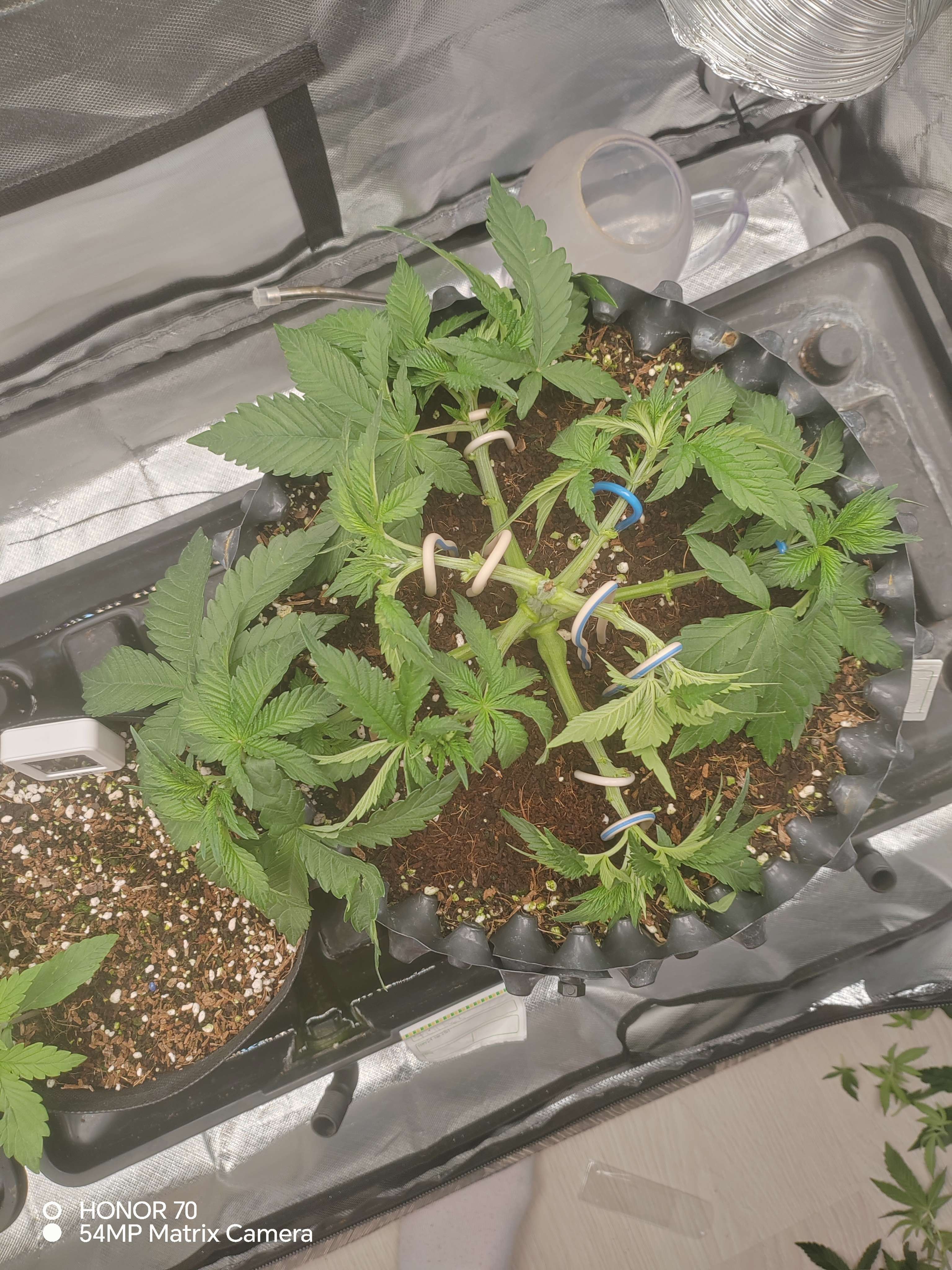 Приветсвую🤝давно не появлялся. За две недели много чего было. В общем:беспокоило меня то что слишком большой показатель пш дренажа, 7,1 ппм наоборот был маленький, 300.при входе 550.сделал вывод что куст голодает скоректировал питание, стал давать больше базы. Щас вход 850-900 пш 5,5. Выход 600 - 6,9.пш все равно большой. Думал начну кормить больше и он упадет, но пока стоит на месте. Пару раз за две недели делал дефолацию, убирал большие веерные лопухи и немного убрал второстепенных веток с низов. В самом верху при загибании треснул ствол. Потом давольно сильно надломилась одна из основных будующих кол, изолента не помогла, пришлось удалить. Думал сильно стресанет. Но нет, замотал изолентой, через пару дней он оклимался. Стресоустойчивость у него хорошая👍неделю назад давал стим по листу Simlex Vega. Раз в неделю опрыскиваю эпином. Так же раз в неделю добовляю в компот циркон. Пока что всё. Едем дальше🤝