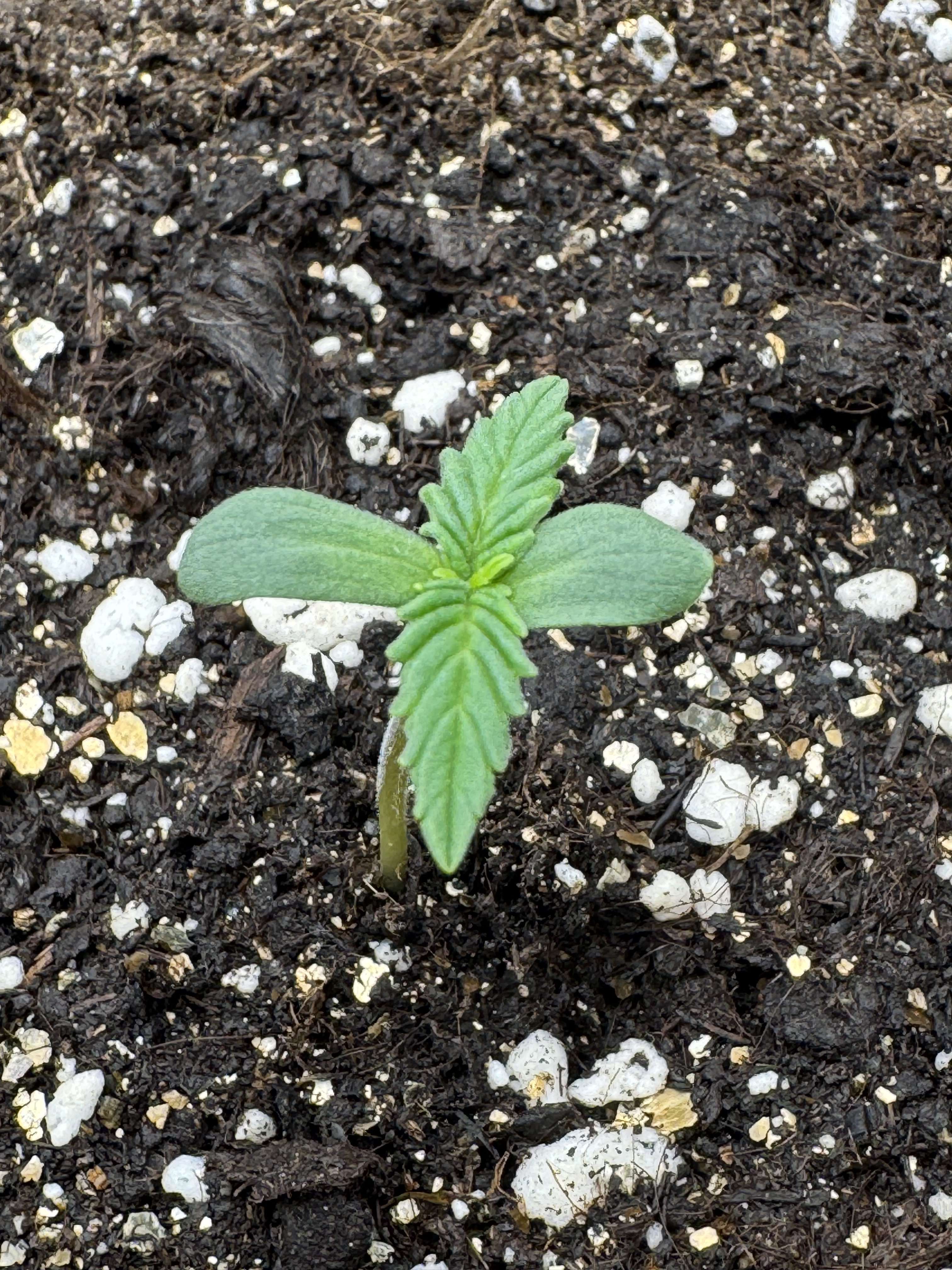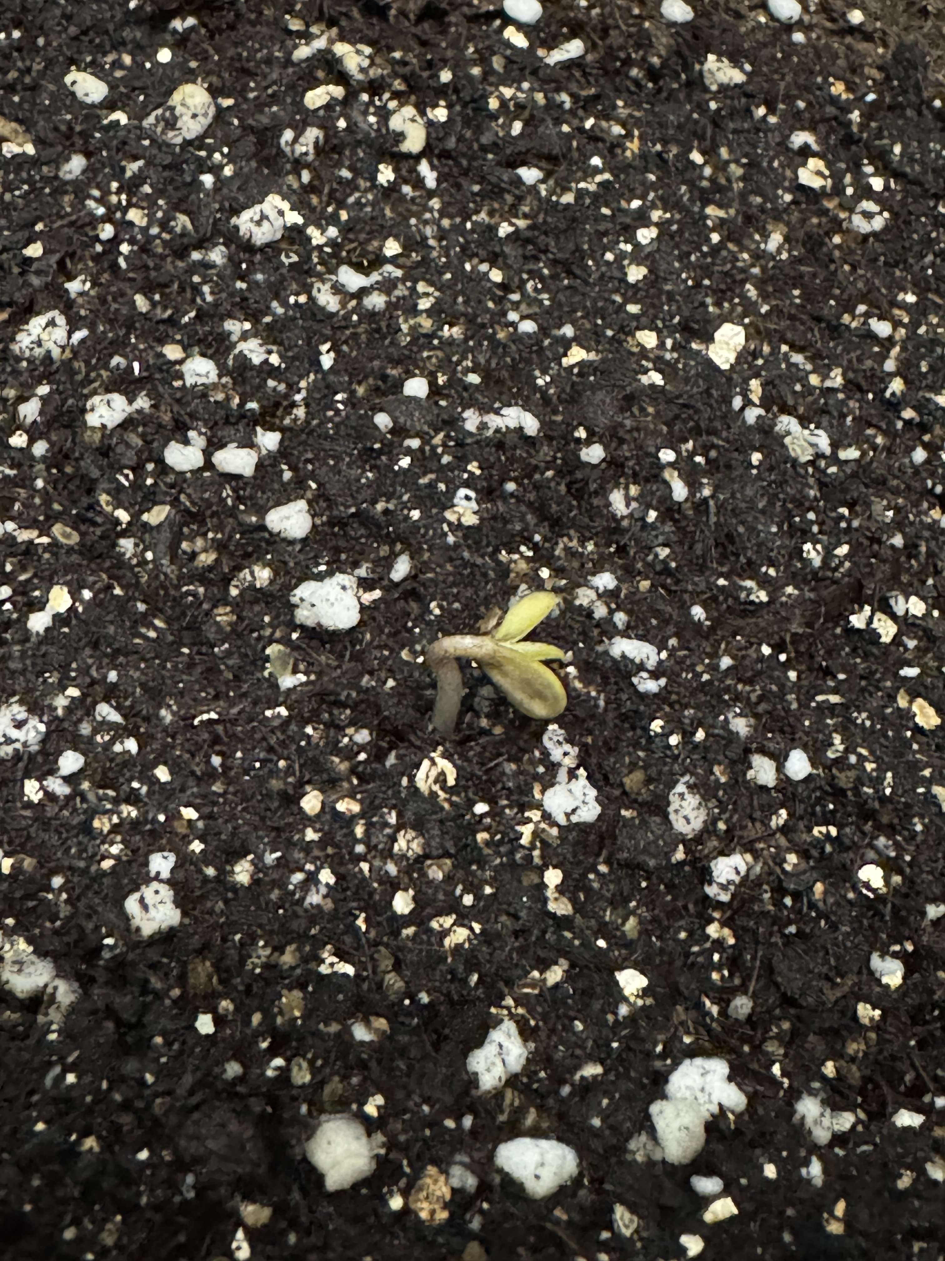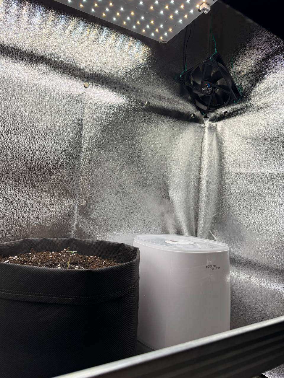27.07.2025 Успешно сбросила каску еще в земле. Включен quantum board 150Вт, диммер установил на ~30-40% (~10 000 lux) Уже провел два раза полив, так как земелька подсыхала. По 200мл осмотической водой PPM 50, Ph 6.2 Из нового: стал рядом ставить замороженные бутылки, вроде на 1 градус температура падает)