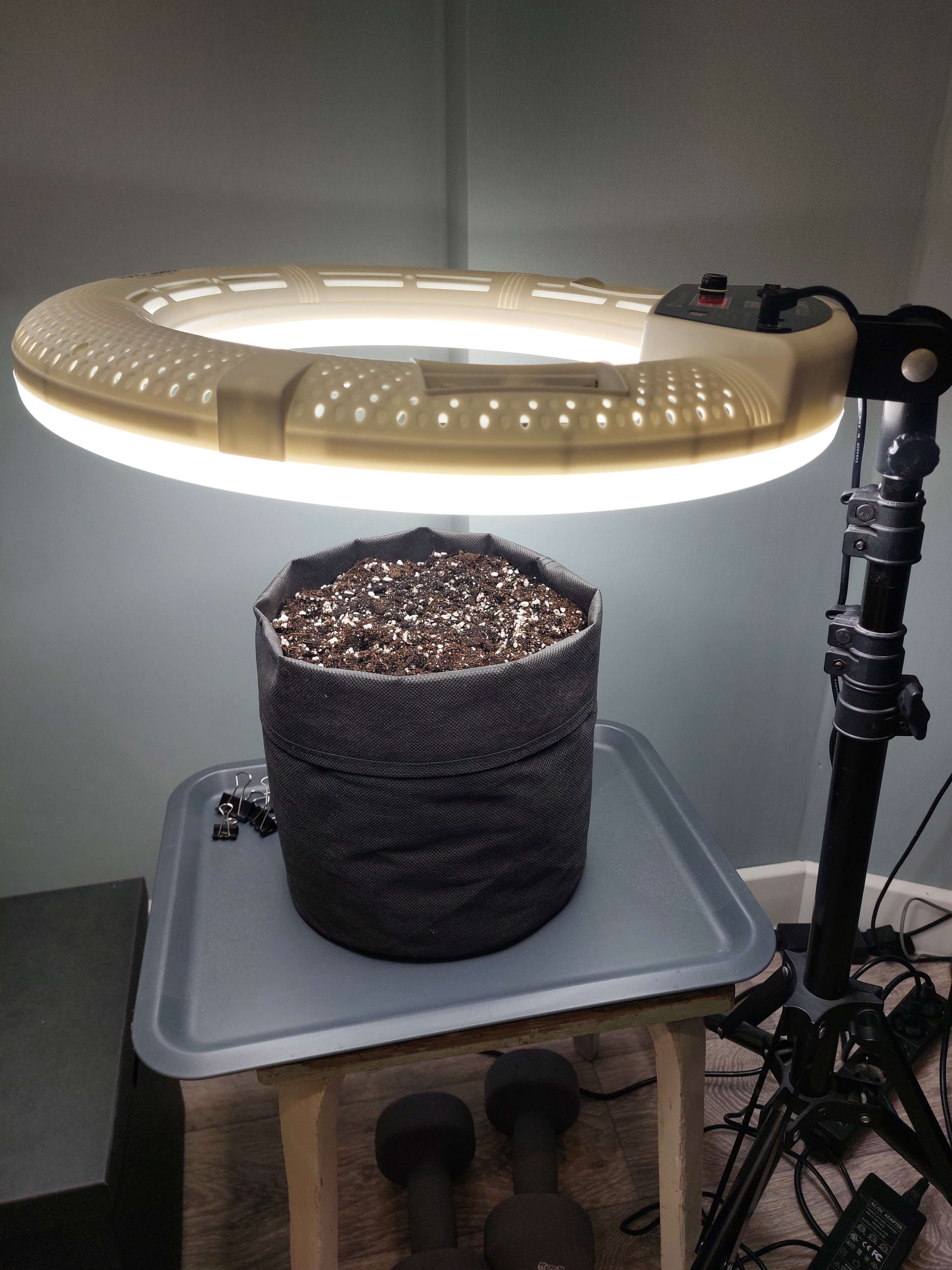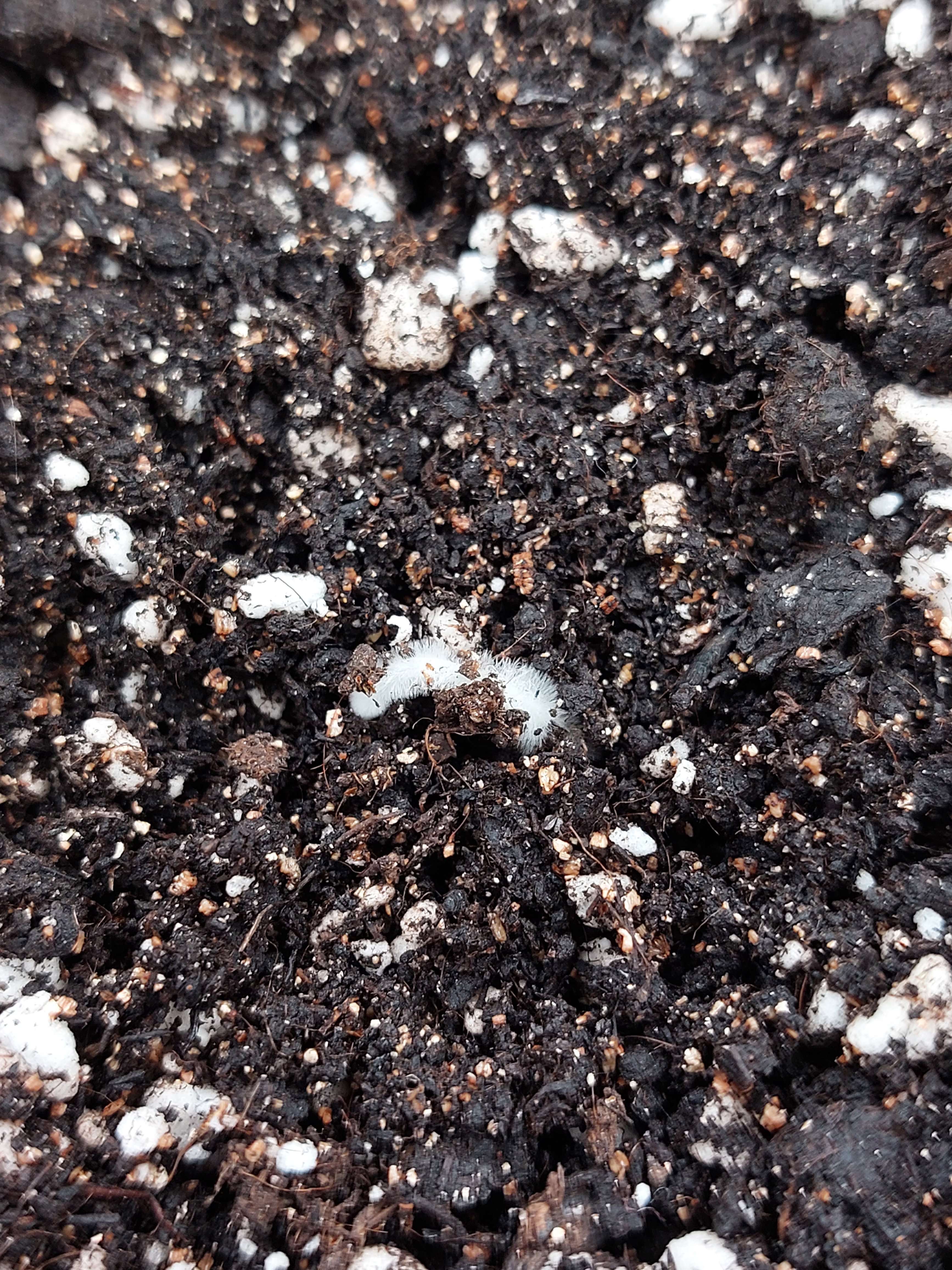 Спустя сутки после посадки обнаружил такой мохнатый всход (похоже на плесень) видимо передоз влаги. Перед посадкой горшок 10л был пролит 1,5л воды. Затем посадил ростком вверх в лунку 1см, обильно попшикал, накрыл плёнкой с дырочками. Ставил на солнце по возможности. Сейчас плёнку снял, поставил под лампу, расстояние 15см. Земля стала подсыхать по краям.