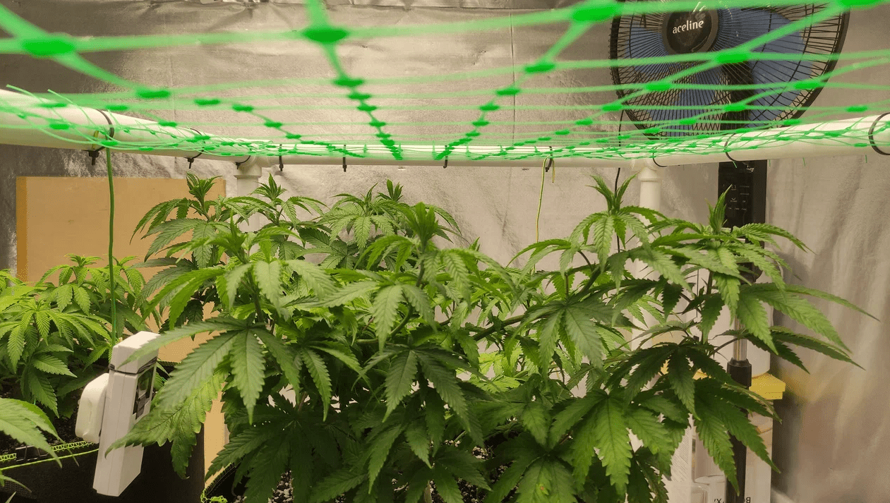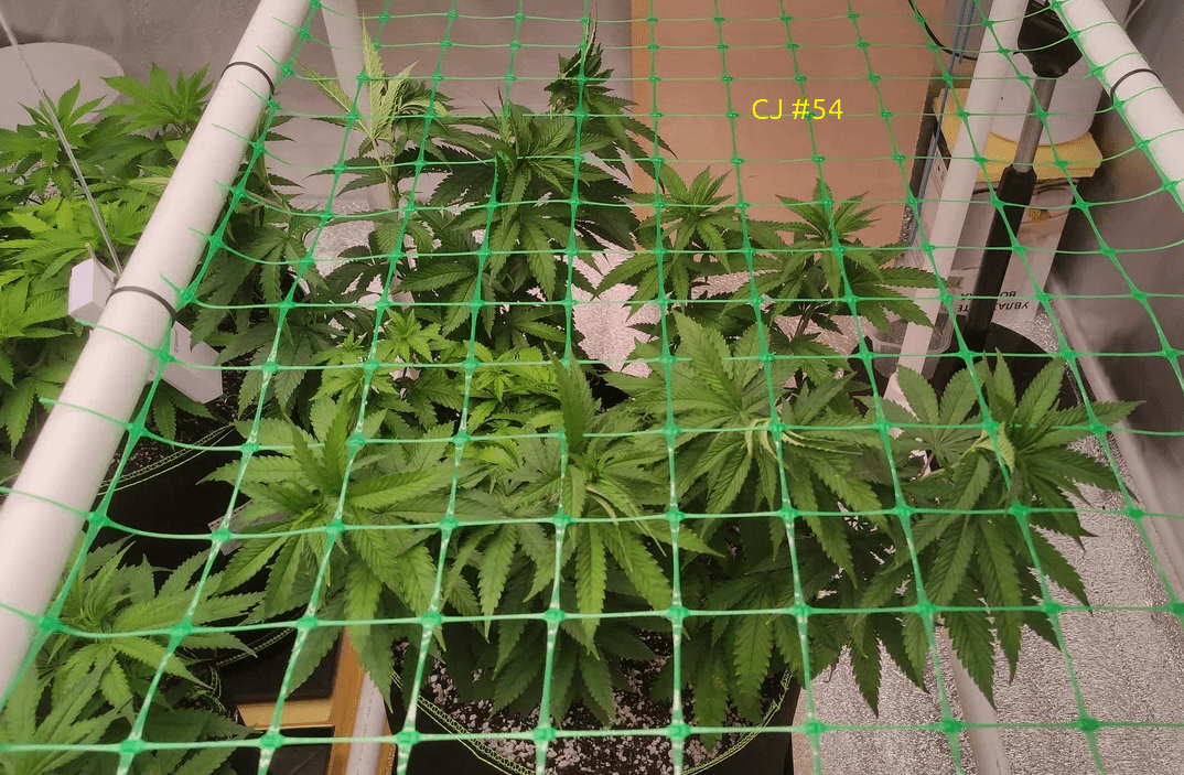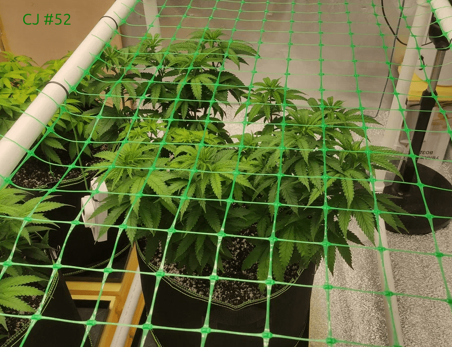 Поставил куст под скрог, снял все растяжки. До сетки 4-5см. Каждый день всё, что вытягивается из под сетки, опять прячу под сетку. Не совсем понимаю, как тут правильно, может опытные ребята подскажут?