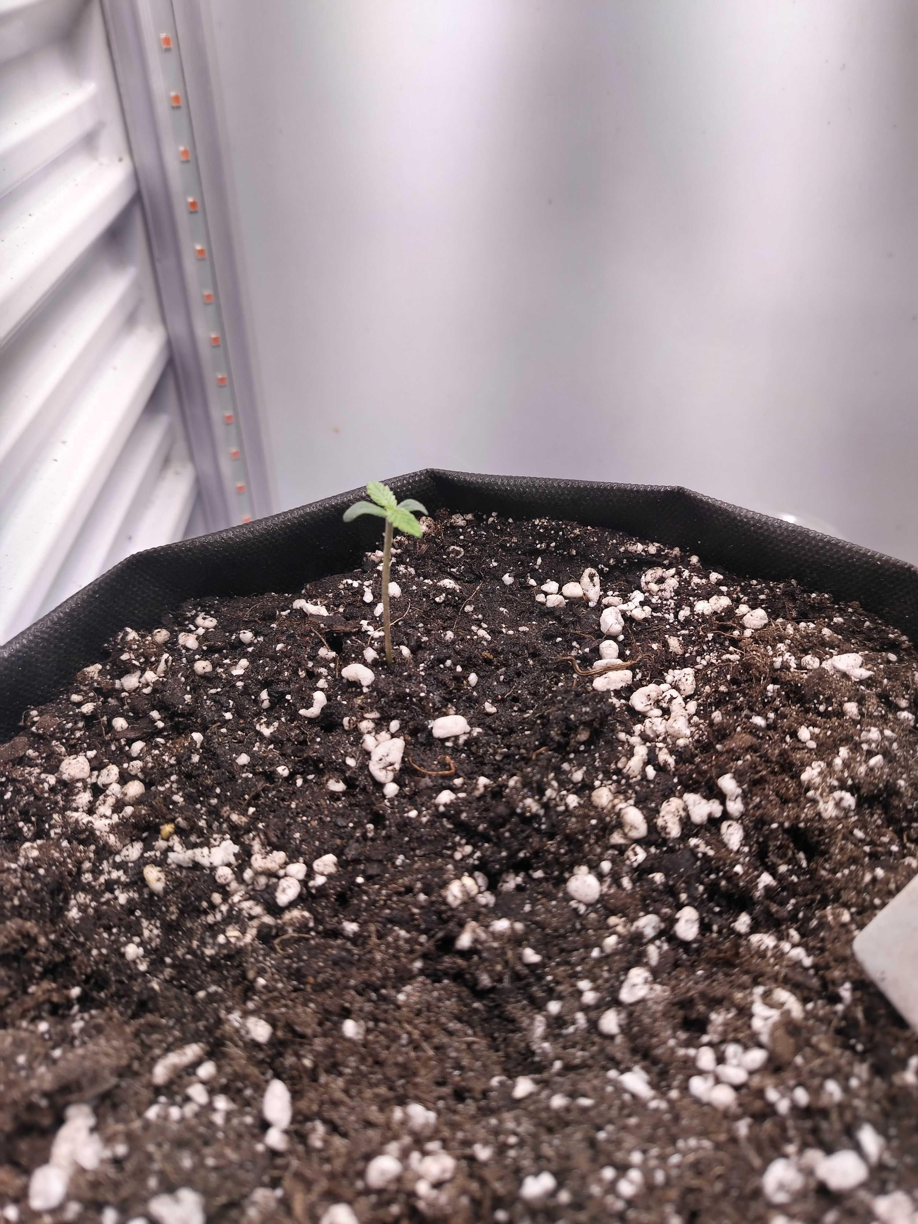 Орех закинул в стакан воды, добавив 10 капель перекиси водорода. Через 2 дня показался корешок. В этот же день был посажен. Горшок-тряпка на 10 литров. Грунт роза+лимон(сад чудес)+перлит. На дне слой пенопласта 5 см. На следующий день красотка появилась на свет. Каску оставила под землёй. Поливаю с пулика пару раз в день. Что делаем дальше? Попутно рядом в тумбочке посадил клон фотика. Сорт не знаю. Но это так, покурить листвы пока автик растет.