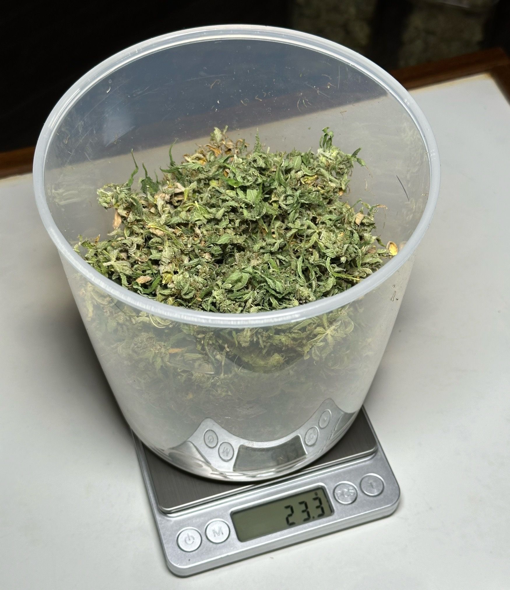 Вес мелочи и попкорна к итоговому прибавлять не стала ) сильно перед сушкой шишки не маникюрила, маникюрила их уже после высыхания. Потом вся эта мелочь и тримминг ушли в масло 🙂